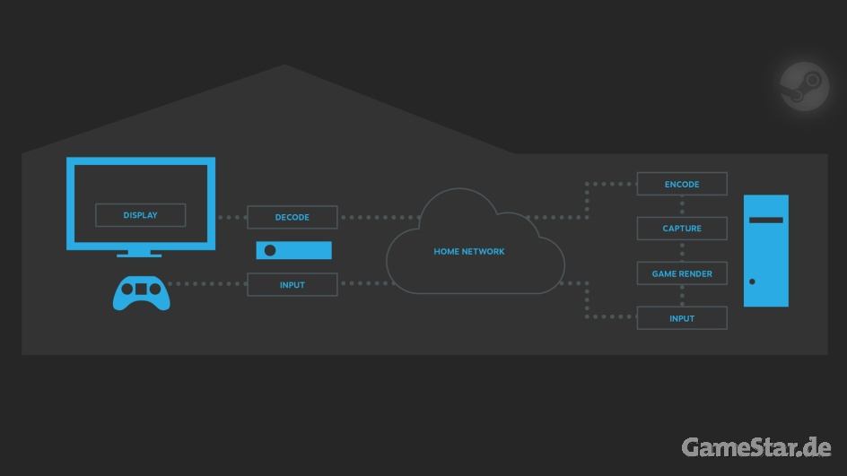 Für Steam In-Home Streaming werden zwei PC gebraucht. Ein leistungsfähiger Host, auf dem das Spiel ausgeführt wird. Und ein weniger potenter Client, zu dem das Spiel gestreamt wird. Auf beiden Rechnern muss Steam installiert sein. An den Client werden die Eingabgeräte angeschlossen (Maus, Tastatur, Gamepad, ...) und die Steuersignale per Netzwerk an den Host übertragen.