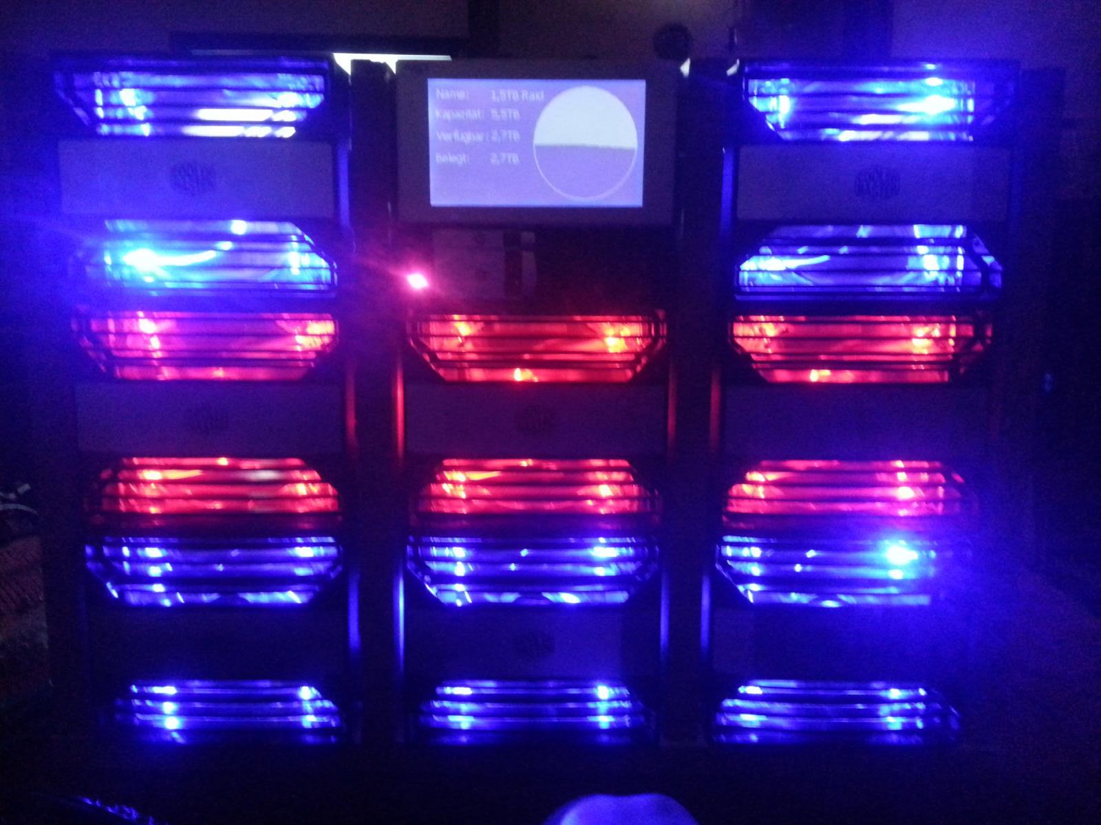 Das gehäuse ist selfmade und besteht aus 19mm MDF und bietet Platz für bis zu 34 HDD's