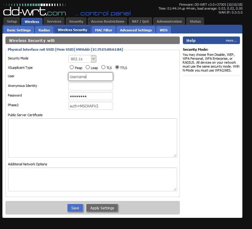 Zur Anmeldung an dem Hotspot wird als EAP-Methode "TTLS" vorausgesetzt und "MSCHAPV2" für die Phase2-Authentifizierung benötigt.