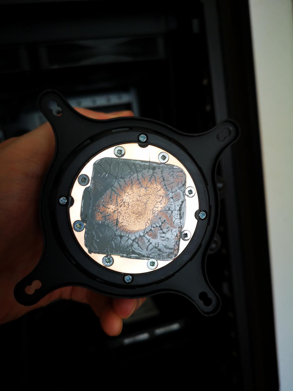 , dann Ganz dünn Conductonaut drauf und Silikon und verklebt, dann wieder rein und WOW er macht nen Bild dann ins Bios und der Schock 40grad paar sek später 60 steigend ich oh nein zu wenig Conductonaut, dann sehe ich huch Wakü keine LED an oh Beide kabel niocht angeschlossen, Also zack angeschlossen nochmal ins Bios und 20 grad 24 Grad im Idle mom 24 Grad voher 30-34 also denke aktion geglückt Voll last noch net probiert nur mal schnell Cinebench und da ohne was zu tun von 2415 auf 2463 Punkte, absolut nix geändert. Bilder Folgen