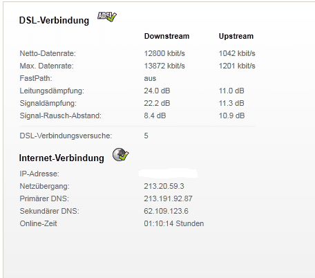 Momentan habe ich direkt das Modem von Alice am Rechner (IAD 3221). Die Modemdaten kann ich leider erst heute Abend reinstellen, da ich dann erst wieder zuhause bin. Ich kann die Leitungsdaten im Modem abrufen und einen Screenshot von Leitungsdaten posten (Sync und DB Werte).