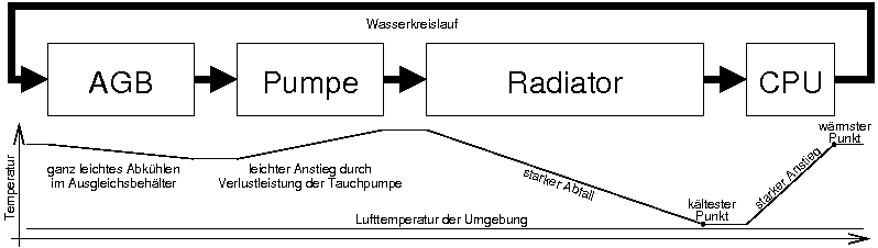 Momentan denke ich viel über die Optimierung des Kreislaufs in der WaKü nach. Bei einem Kreislauf mit sehr geringem Durchfluß müßte sich folgendes Temperaturverhalten zeigen, wenn man an verschiedenen Stellen die Temperaturdifferenzen mißt.
