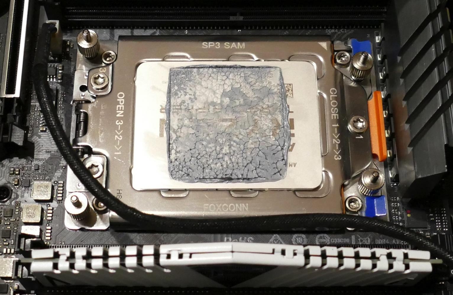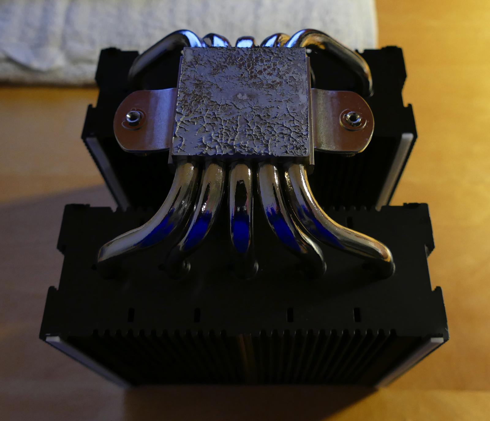 Nur kurz als Warnung: Hab mir für mein TR-System einen Phanteks PH-TC14PE CPU-Kühler geholt in der Hoffnung, dass die Kühlleistung unter der zu kleinen Bodenplatte (siehe Bild) nicht zu sehr leidet. Ergebnis: Im Idle kann ich froh sein, wenn die CPU unter 40° (Offset rausgerechnet) bleibt, und sobald auch nur ein bisschen Last anliegt dreht der Lüfter trotz einer auf minimale Geräuschentwicklung ausgelegten Lüfterkurve sofort hoch. In Prime erreicht die CPU in weniger als 1 Minute die maximal zulässigen 94° (inkl. Offset). Nicht so erfreulich...
