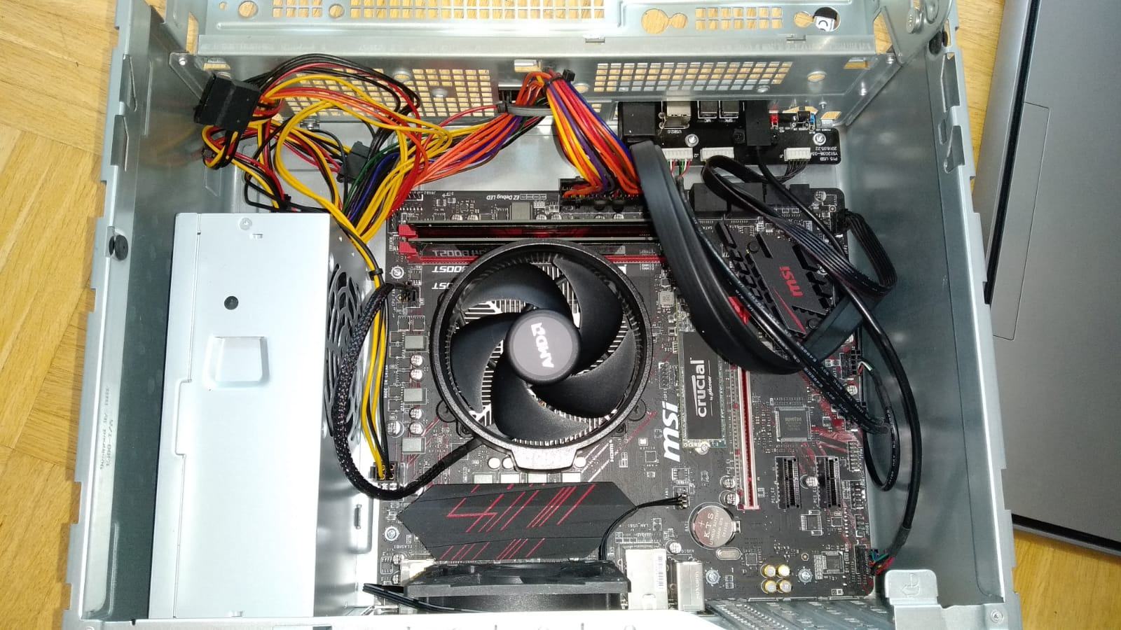 Der Lüfter wird unter den Kühllamellen angebracht. So wird die Luft von unten angesogen, zieht noch Luft von den Spannungswandlern weg und bläst durch die Kühllamellen des CPU Kühlers noch oben durch die Lüftungsschlitze des Gehäusedeckels. So war das zumindest gedacht von mir. Gibt's bessere Alternativen?