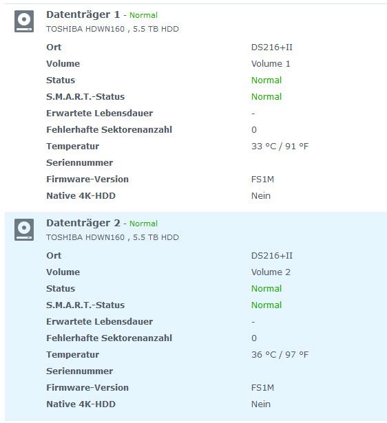 Die beiden Toshiba N300 6TB - Festplatten bieten eine gute Performance bei noch akzeptablen Werten für Lautstärke, Temperatur und Stromverbrauch. Während des Testzeitraumes sind keine Probleme mit den Festplatten aufgetreten und auch die SMART-Werte schauen nach wie vor sehr gut aus.