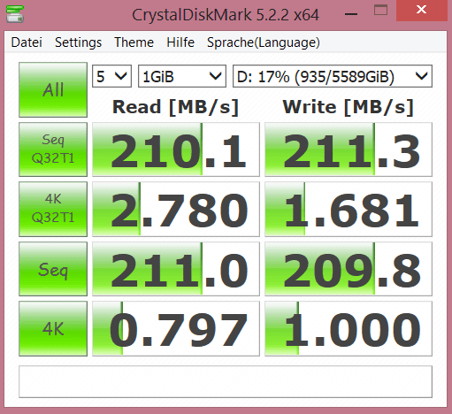 Was hierbei sehr beachtlich ist, ist die Geschwindigkeit der Lese- und Schreibvorgänge. Angeben von Toshiba sind Geschwindigkeiten bis 210 MB/s – Diese werden bei dieser HDD sogar übertroffen um fast 4 MB/s. Die Festplatte hält was von Toshiba versprochen wird.