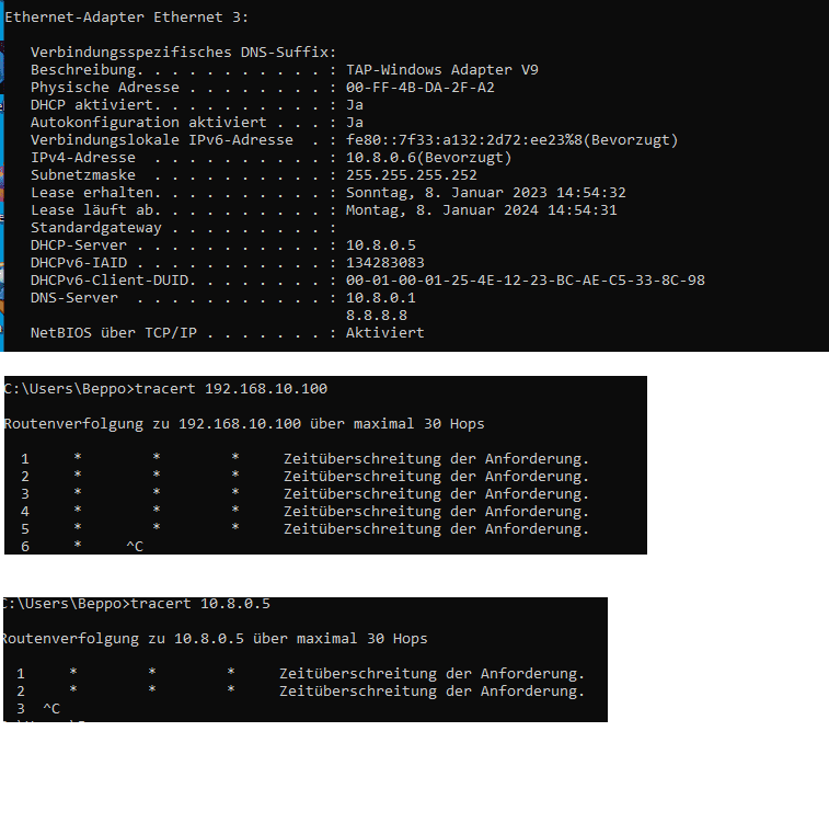 Später habe ich dann probeweise einen zweiten Client verbunden, hat die 10.8.0.10 bekommen. Auch hier ist ein ping "untereinander" nicht möglich.