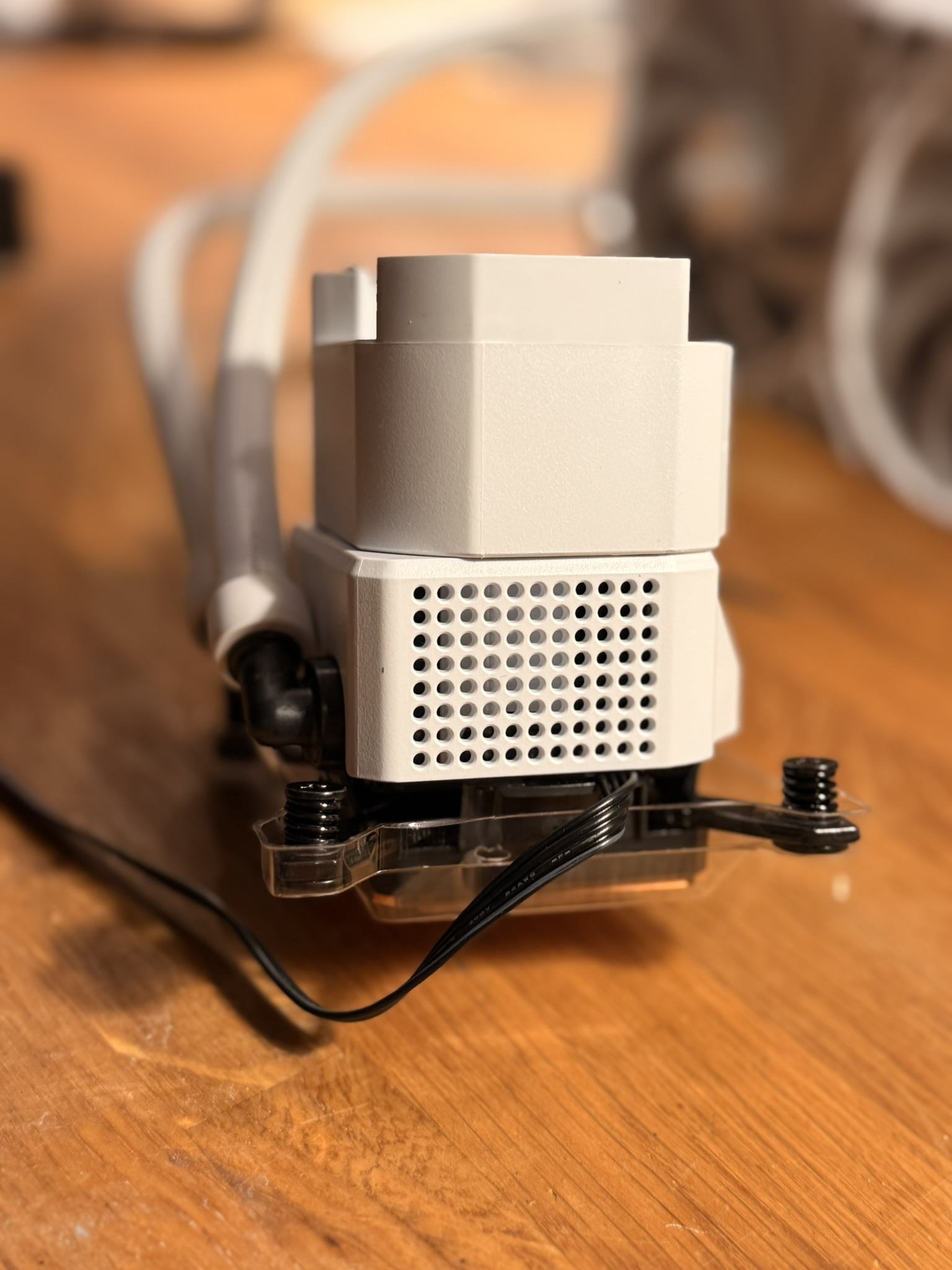 - Der Block kann (logischerweise) nur in einer Ausrichtung montiert werden, durch die nach unten zeigenden Schläuche kann ich mir vorstellen dass eine Luftblasenbindung im Kühlblock stattfindet.
