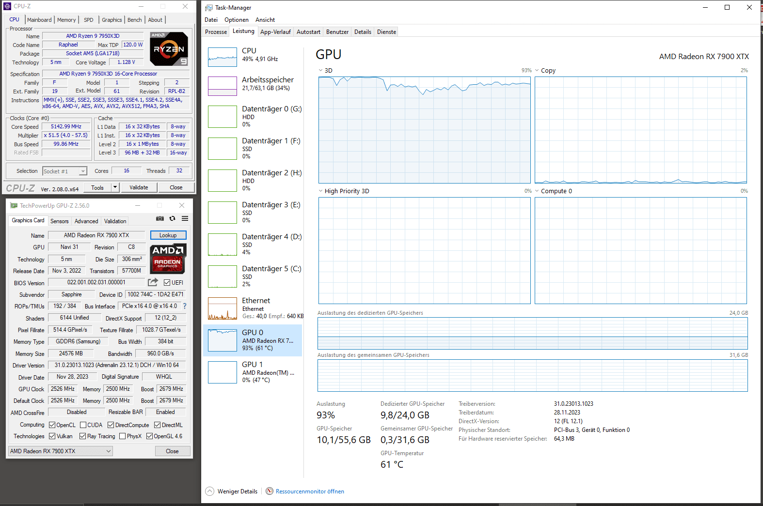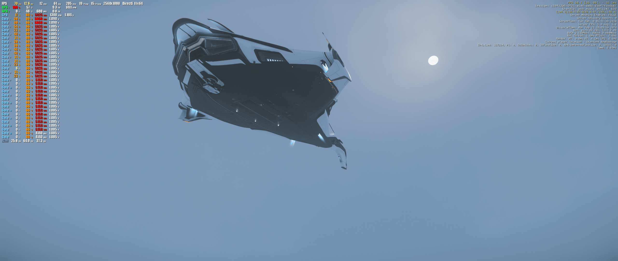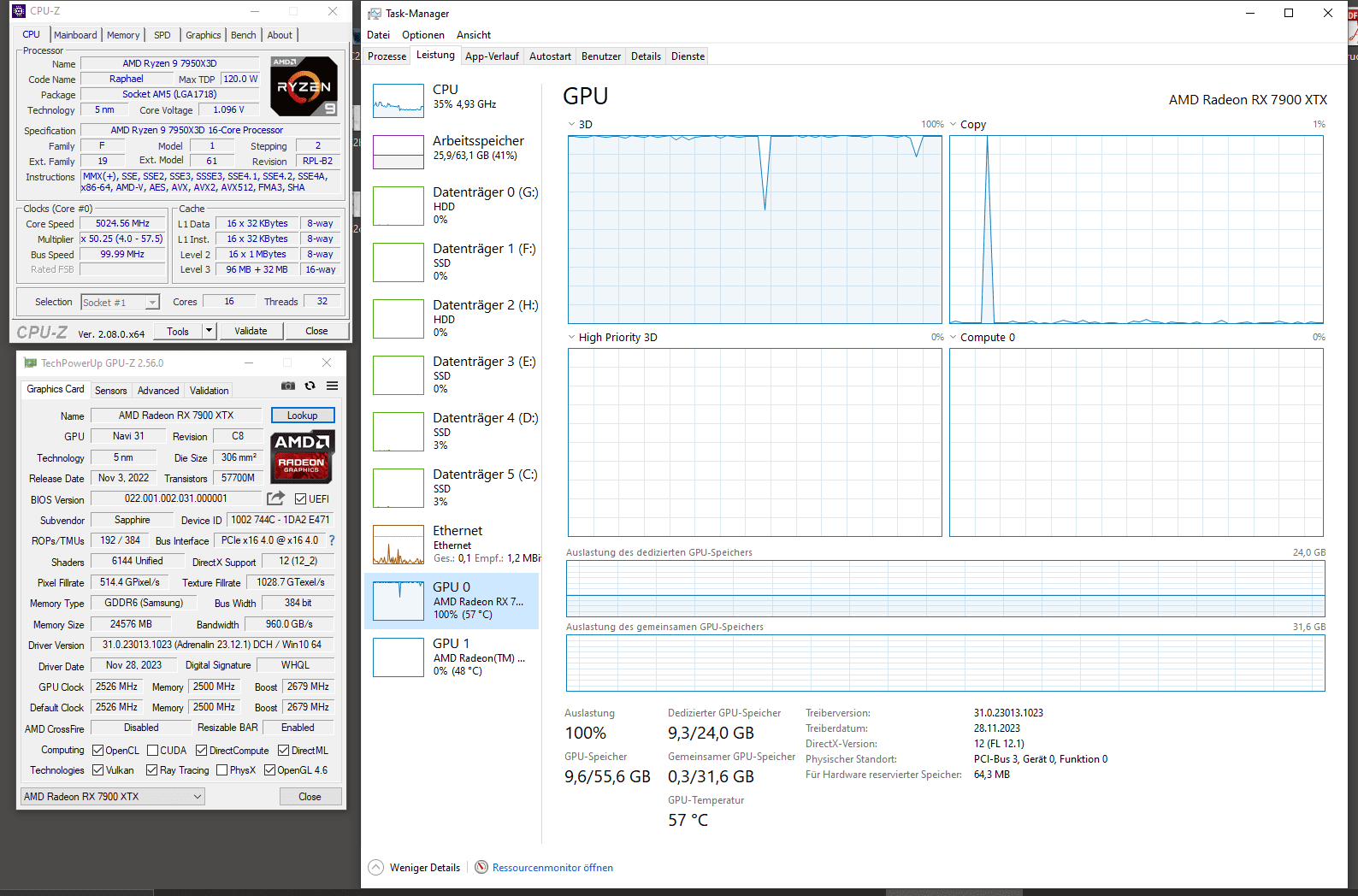 Die Systemauslastung zeigte, dass die GPU auf Anschlag lief und die CPU so bei um die 65% Auslastung lag. Um die Graka als vermuteten/unterstellten Flaschenhals auszutauschen, habe ich zur 7900 XTX gegriffen, die ich heute ja auch noch habe. Die Auslastung änderte sich wie folgt: Die CPU blieb unverändert bei um die 65% und die Graka "dümpelte" zwischen 40 und 60% im Durschnitt. Sie erreichte nie 100% wenn ich Star Citizen spielte (beim MSFS genau dasselbe). Hier jetzt den Fehler auszumachen war schlicht unmöglich, also habe ich die Maschine zunächst softwareseitig komplett neu aufgesetzt. Es hätte ja auch ein Treiber- oder Windowsproblem sein können. War es aber nicht.