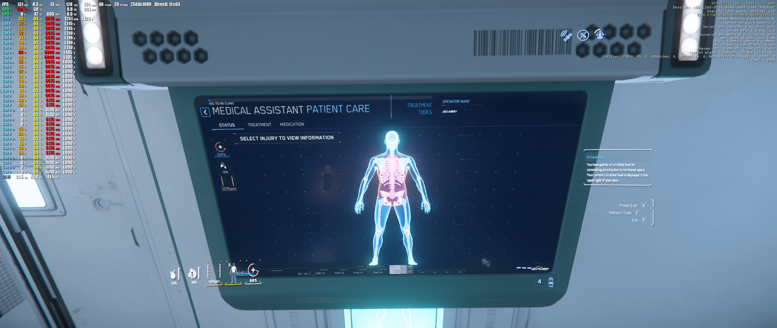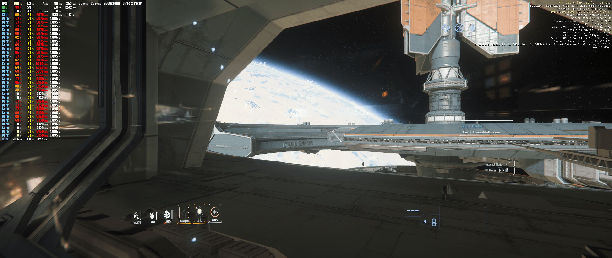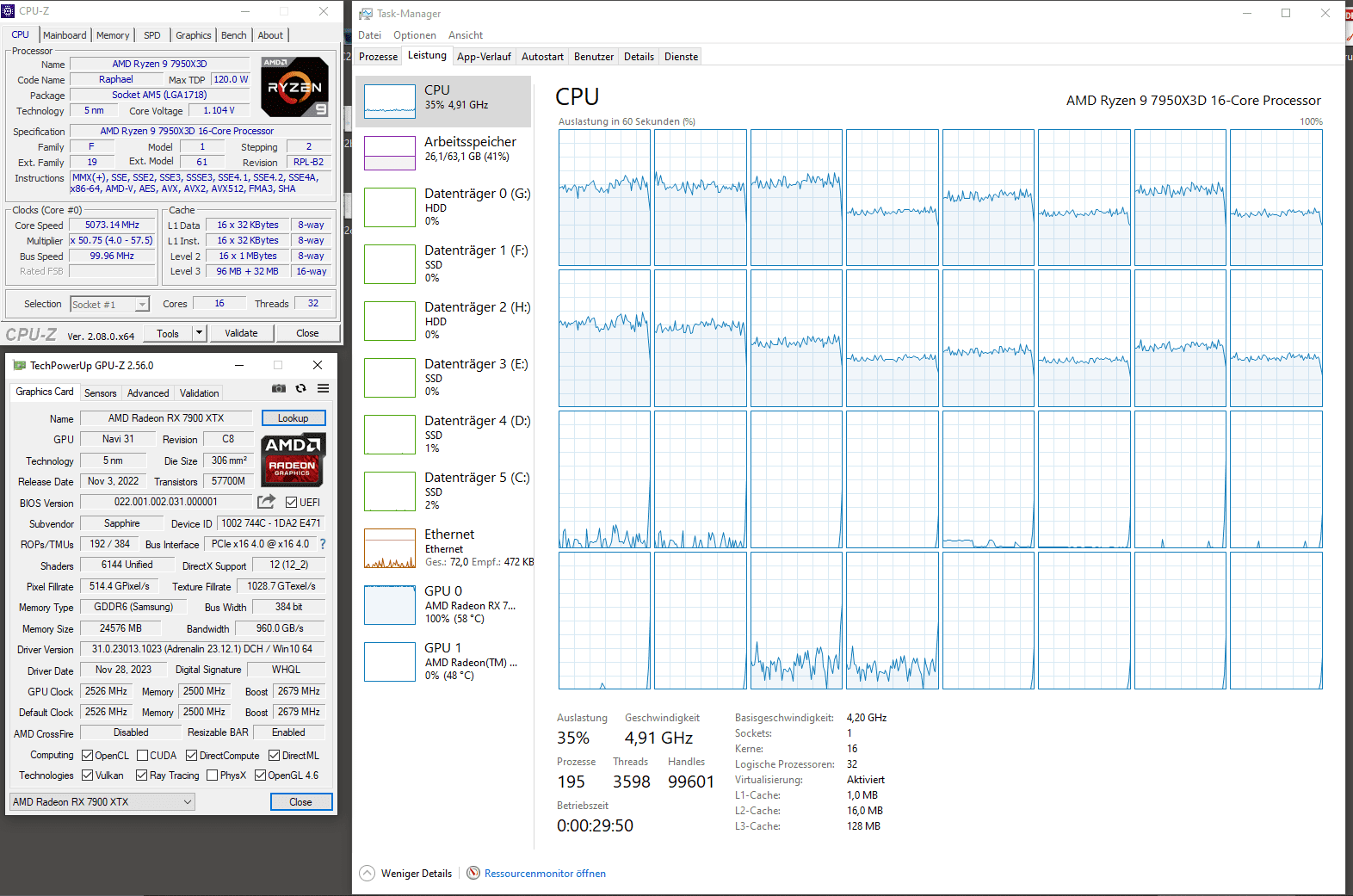 Die Systemauslastung zeigte, dass die GPU auf Anschlag lief und die CPU so bei um die 65% Auslastung lag. Um die Graka als vermuteten/unterstellten Flaschenhals auszutauschen, habe ich zur 7900 XTX gegriffen, die ich heute ja auch noch habe. Die Auslastung änderte sich wie folgt: Die CPU blieb unverändert bei um die 65% und die Graka "dümpelte" zwischen 40 und 60% im Durschnitt. Sie erreichte nie 100% wenn ich Star Citizen spielte (beim MSFS genau dasselbe). Hier jetzt den Fehler auszumachen war schlicht unmöglich, also habe ich die Maschine zunächst softwareseitig komplett neu aufgesetzt. Es hätte ja auch ein Treiber- oder Windowsproblem sein können. War es aber nicht.