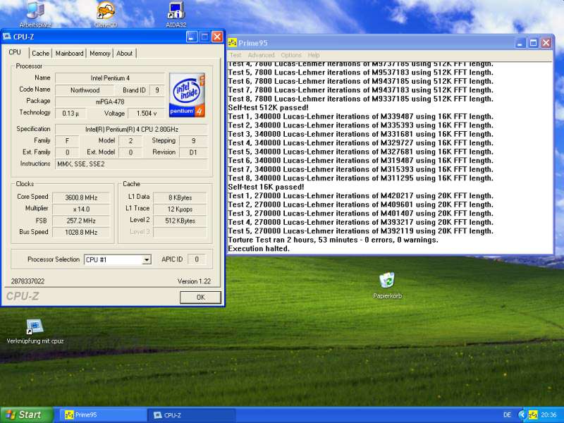 mit Default VCore@14x257=3,6Ghz. Wie gesagt AIDA sagt 1,47-1,49VCore.