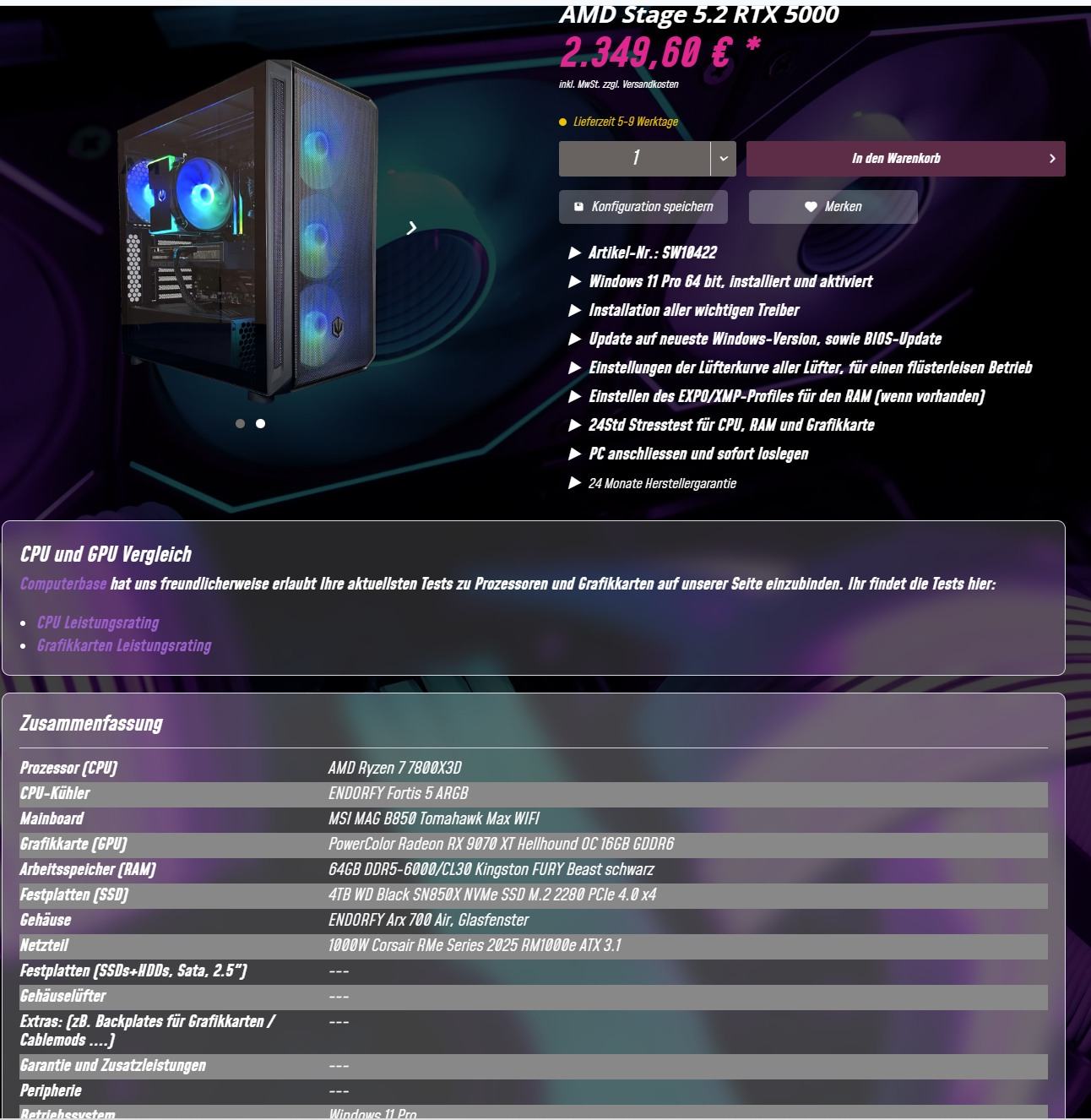 5700X3D ca. 220 €, GrafikkarteRX Hellhound 746€ oder RX 9070 XT Nitro+ 776€, SSD 4T WD Black ca 340€.