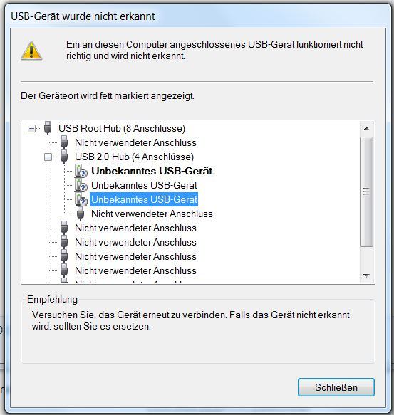 Danach geht nichts mehr an dem Teil. Das Bild auf dem externen Monitor verschwindet, Windows meldet "USB-Gerät wurde nicht erkannt". Alle Funktionen der Station hinfällig.