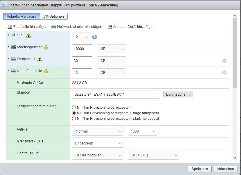 Jetzt möchte ich der nappit appliance wieder zwei vDisks hinzufügen. Dort gibt es kein ThickProvisioning
