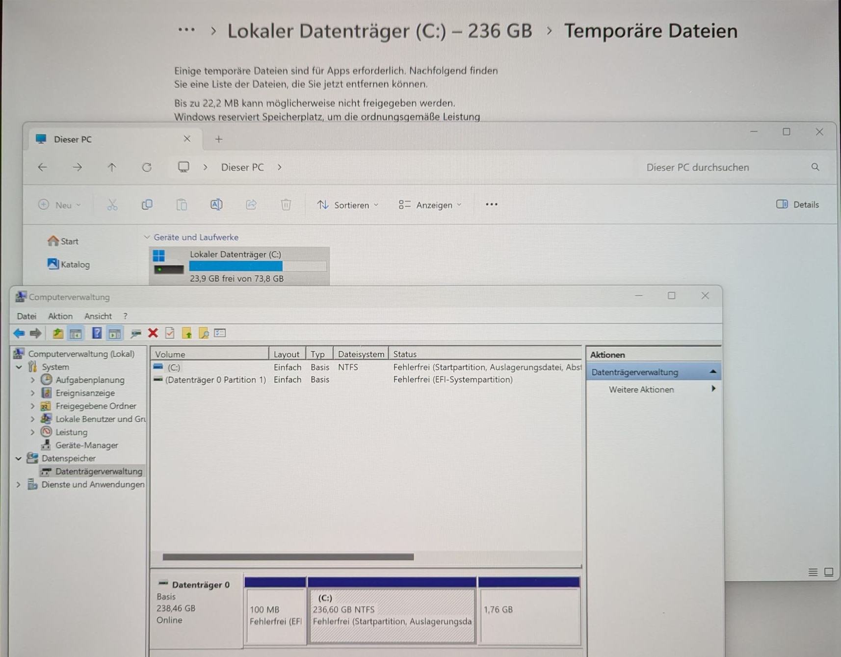 ich habe mir einen Refurbed-PC mit einer 256GB SSD gekauft und unter der Datenträgerverwaltung wird sie auch als 256GB-SSD erkannt. Auch die Partition ist "groß" genug, aber der Explorer zeigt an, dass nur ca. 80gb nutzbar sind.