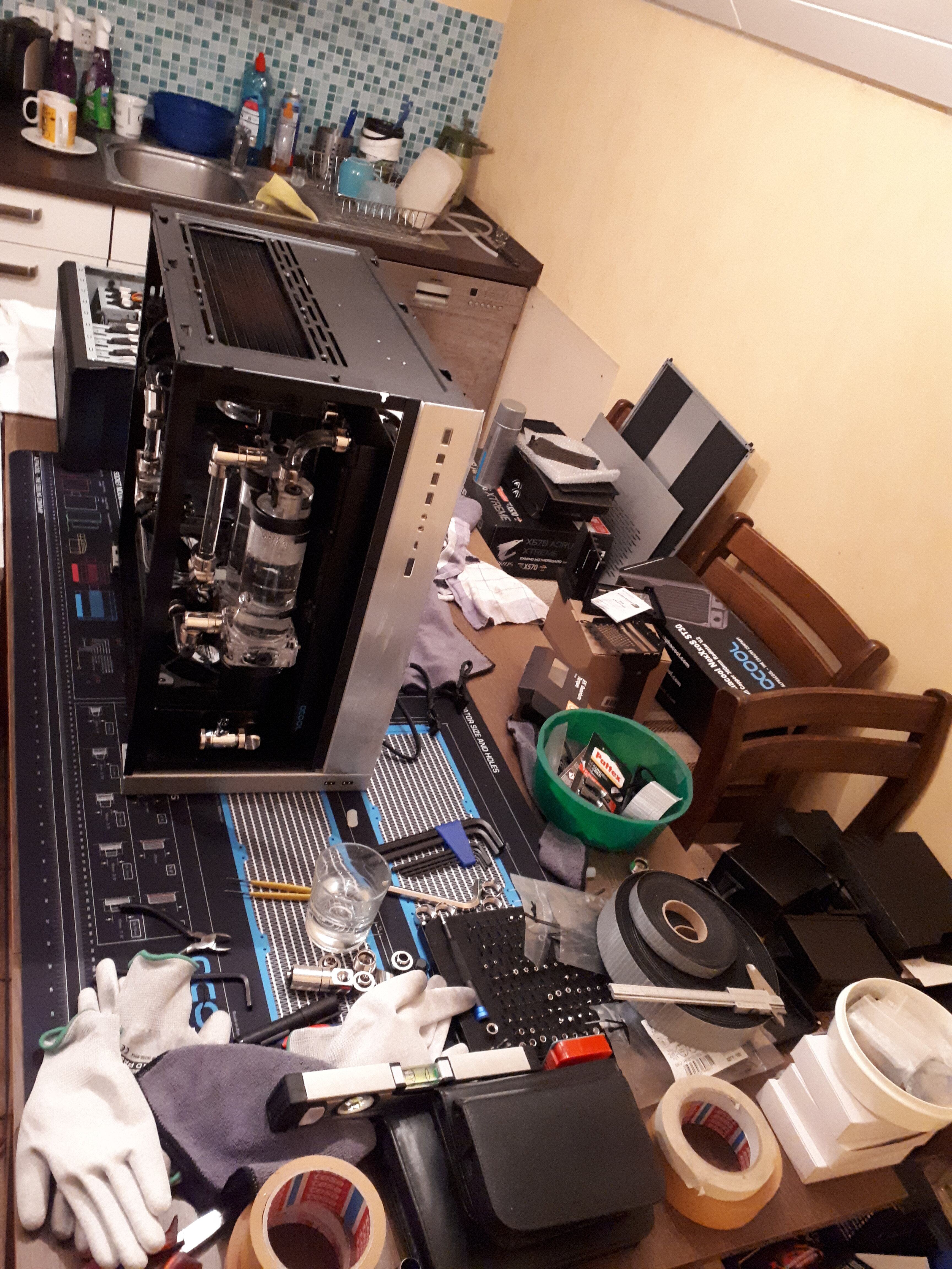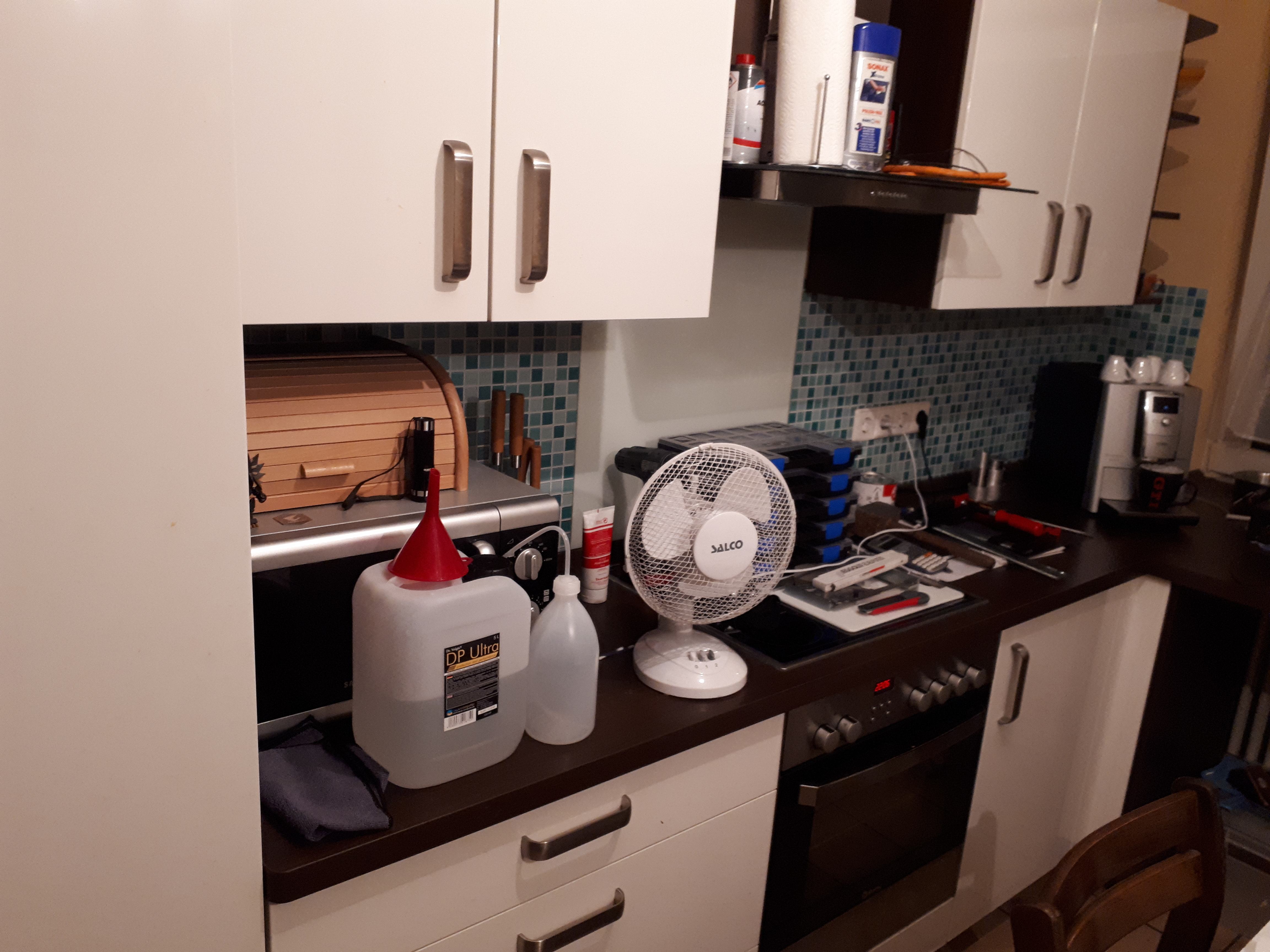 die ist nicht unaufgeräumt, die ist in Betrieb, und sieht noch gut aus, hier mal noch 2 Bilder von meinem Build letztes Jahr, hatte nur die Küche als Bauplatz zur Verfügung, wo ich alles stehen lassen konnte, 2 Wochen lang leben aus der Mikro oder Essen holen auswärts/Lieferdienst waren selbstverständlich :(im Hintergrund die unaufgeräumte Werkstatt)