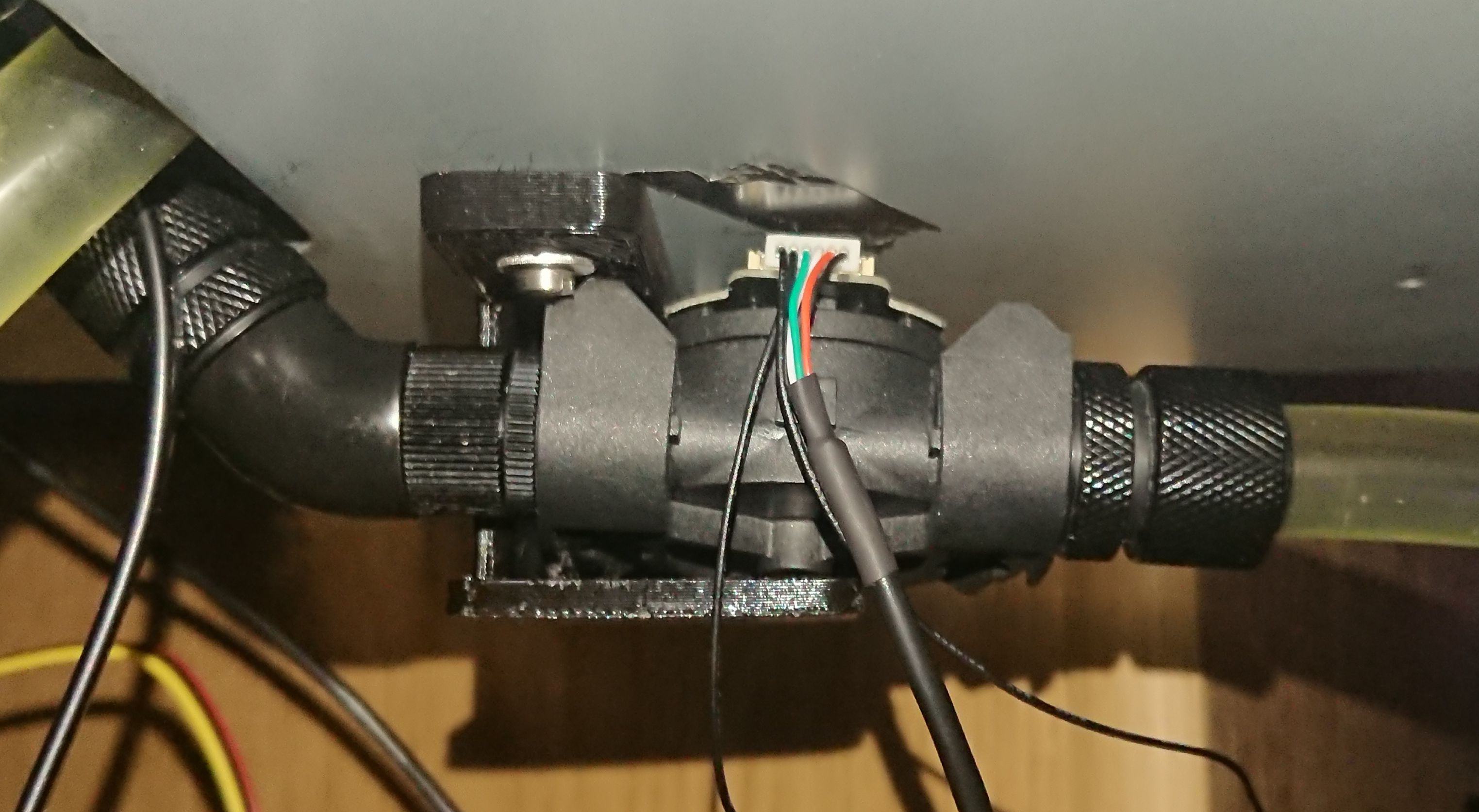 Habe gerade meinen Durchflusssensor mit einer selber gedruckten Halterung an die Zwischendecke von meinem Gehäuse geschraubt.