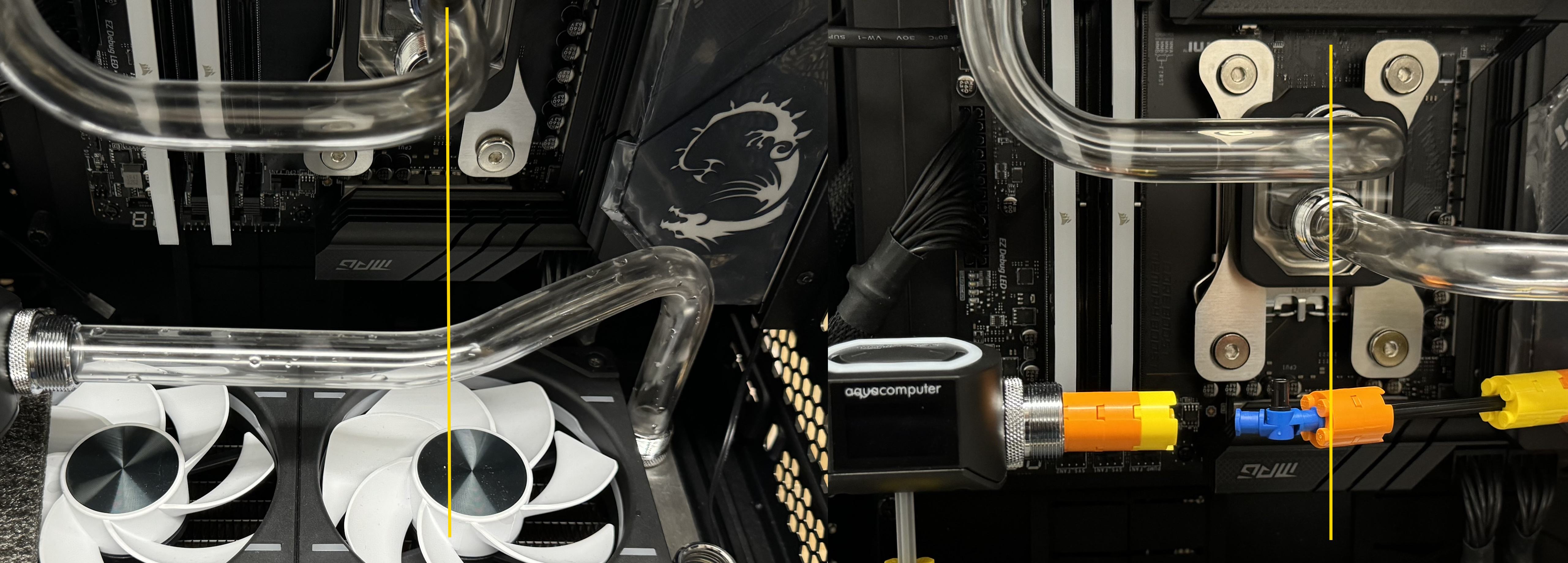 Davon ab gefällt mir der Verlauf mit der Position der Biegung genau unter den anderen beiden Rohren am CPU-Kühler sehr gut: