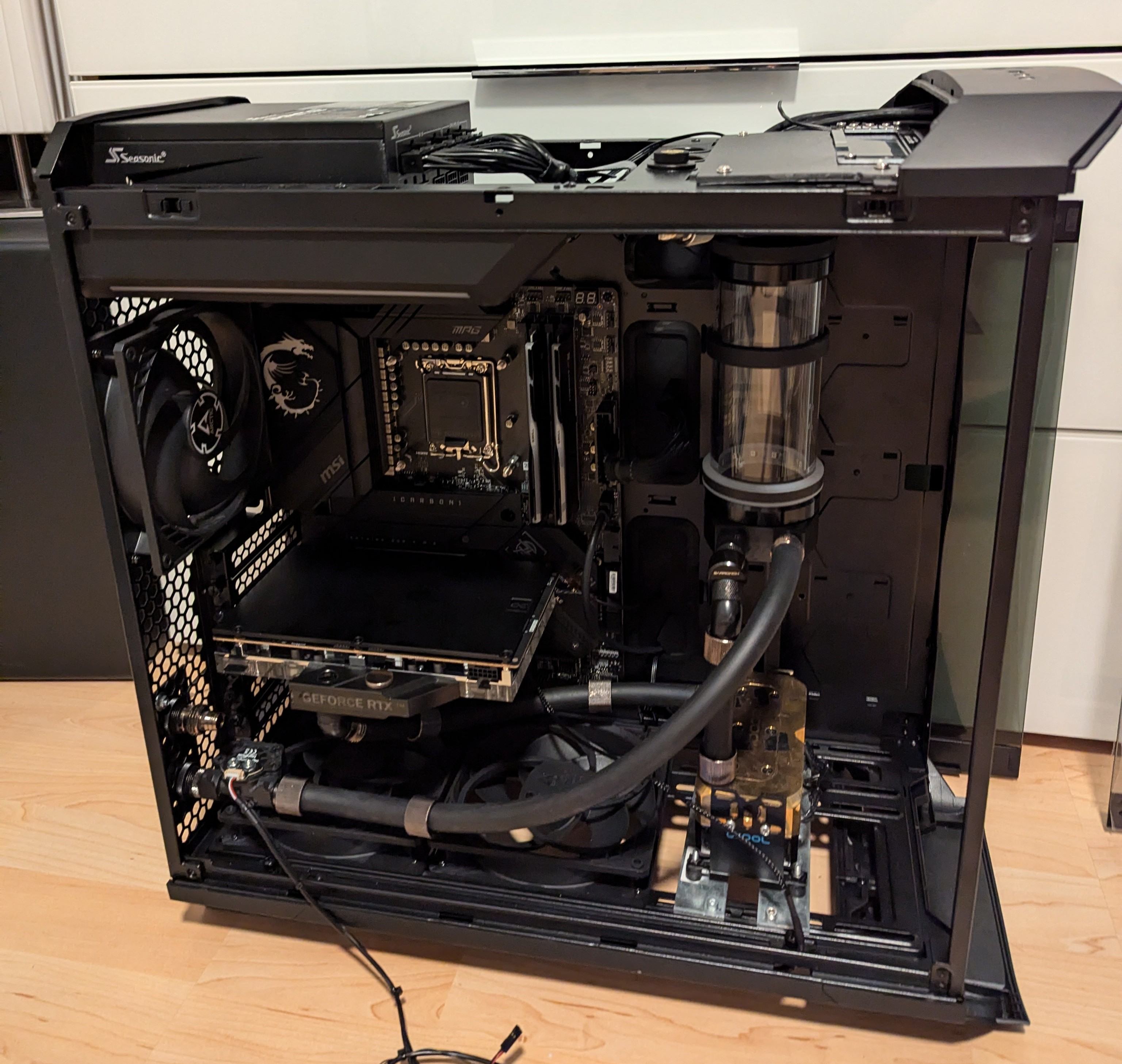 So, dann will ich auch mal. Nachdem ich mein Board+CPU einschicken musste, wurde aus "dann wartest halt solange" ein "dann bauen wir halt um". Meine Hardware ist aus einem Nanoxia DS1 in ein Fractal Torrent umgezogen. Zuvor befand sich ein Bitspower Tank Multi-Z an der Wand. Das hab ich nun auch gleich noch abgeändert und einen Ultitube 150 intern verbaut. Zeitgleich gibts nun Gehäusedurchführungen mit Anschlüssen, zuvor ging der Schlauch einfach durch eine Gummidurchführung nach draußen. Im Deckel musste ich mir eine Halterung fürs Aquaero basteln, da ja kein LW Schacht mehr da ist. Nun muss nur noch die Austausch-CPU kommen, dann kann's fertig gebaut werden. Ach ja, an der Wand hängen natürlich 2 Rudel-MoRas ;)