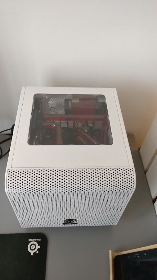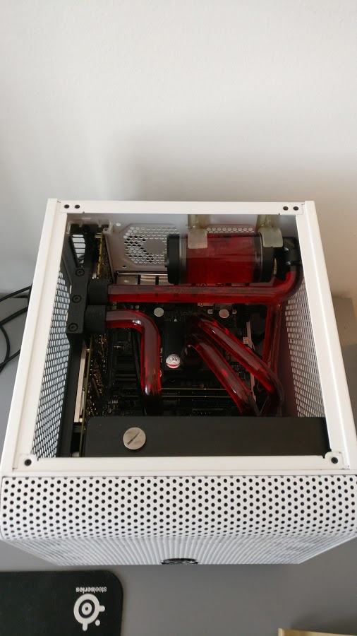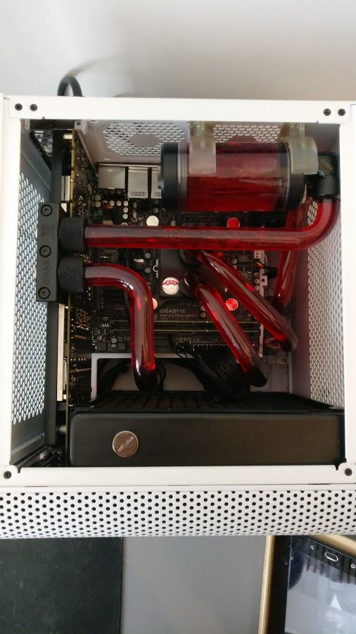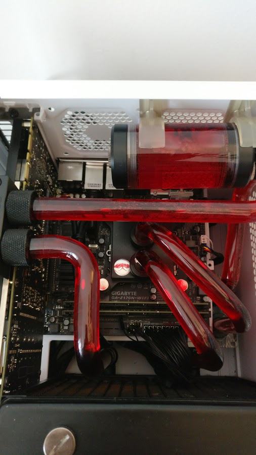 Hier sieht es z.B. so aus, als ob die Biegung auch keine 90° ist. Vergleicht man den Abstand oben am GPU Kühler und unten, dann sieht man, dass die Tube unten viel näher am GPU Kühler ist, was dafür spricht, dass hier irgendwo kein sauber 90° ist sondern z.B. nur 88°