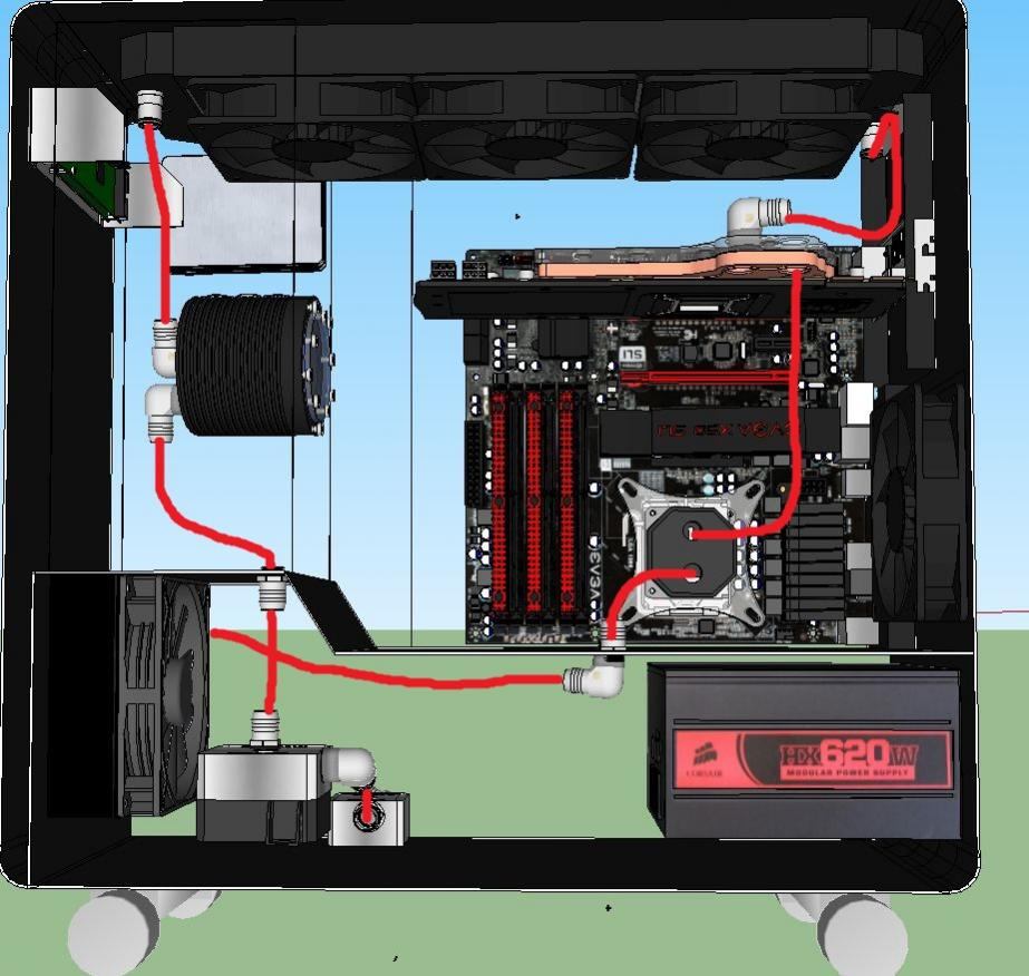 Wenn du die Lüfter über den Radi machst gewinnst du etwas mehr Platz zur Verschlauchung.
