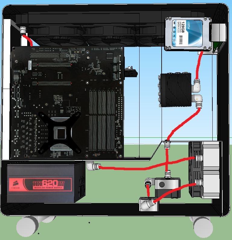 2. Der Aquatube in den LW-Schächten kann gut aussehen, aber das Befüllen wird so die Hölle. Auch wenn du die Anschlüsse richtigerweise besser nach unten machst. Platz für einen Fillport bleibt ja leider im Deckel mit dem Trippleradi nicht mehr. Also wenn schon den Tube in den Schächten dann besser nach vorne raus gucken lassen. So ließe sich das Gehäuse zum Befüllen zumindest auf den Rücken legen. Selbst das macht dann nicht wirklich Spass. Sinnigerweise könnte man den AT natürlich auch in Verbindung mit einem "nur" 240er Radi oben in den Deckel packen was in meinen Augen am besten funktionieren sollte. Die Verschlauchung würde sich dadurch auch vereinfachen und die Kühlleistung der beiden Radis sollte für dein System auch ausreichen.