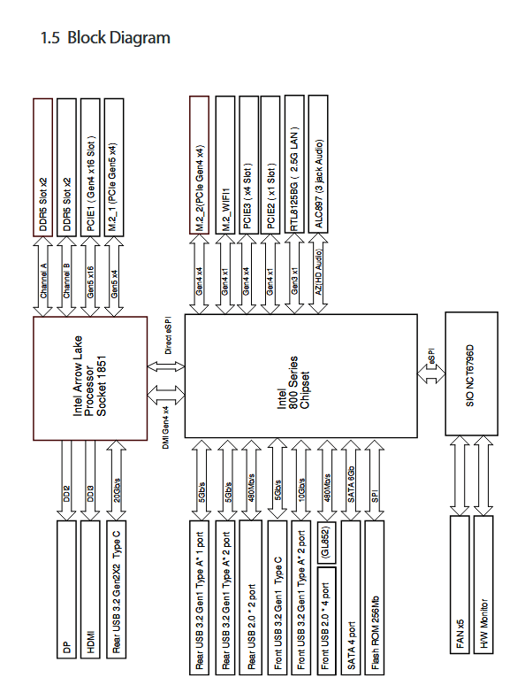 Es gibt eben nur 16 Lanes PCIe 5.0 Lanes von der CPU, wenn diese in einem H810 Board steckt, während es beim W880 und Z890 so aussieht: