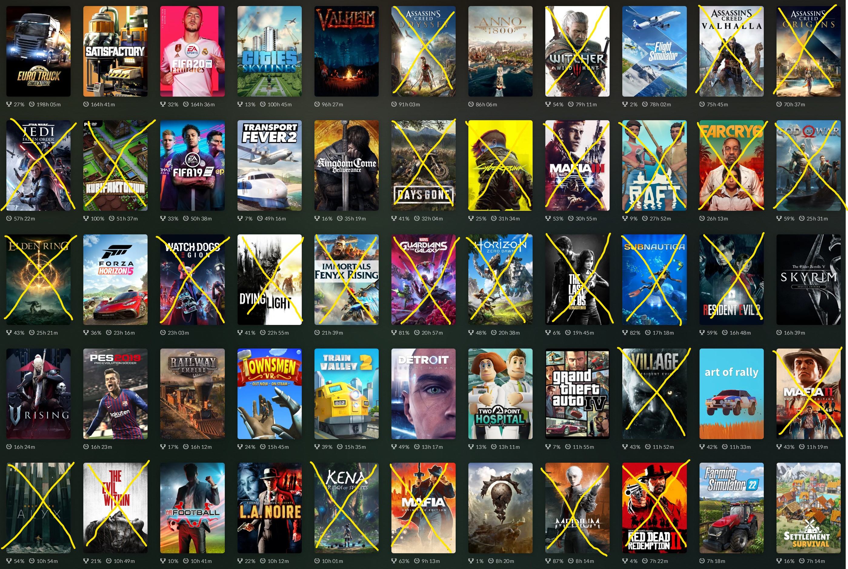 Mal ein Blick auf einen kleinen Auschnitt meiner Spielebibliothek, sortiert nach Spielzeit (durchgestrichene Spiele habe ich durchgespielt)