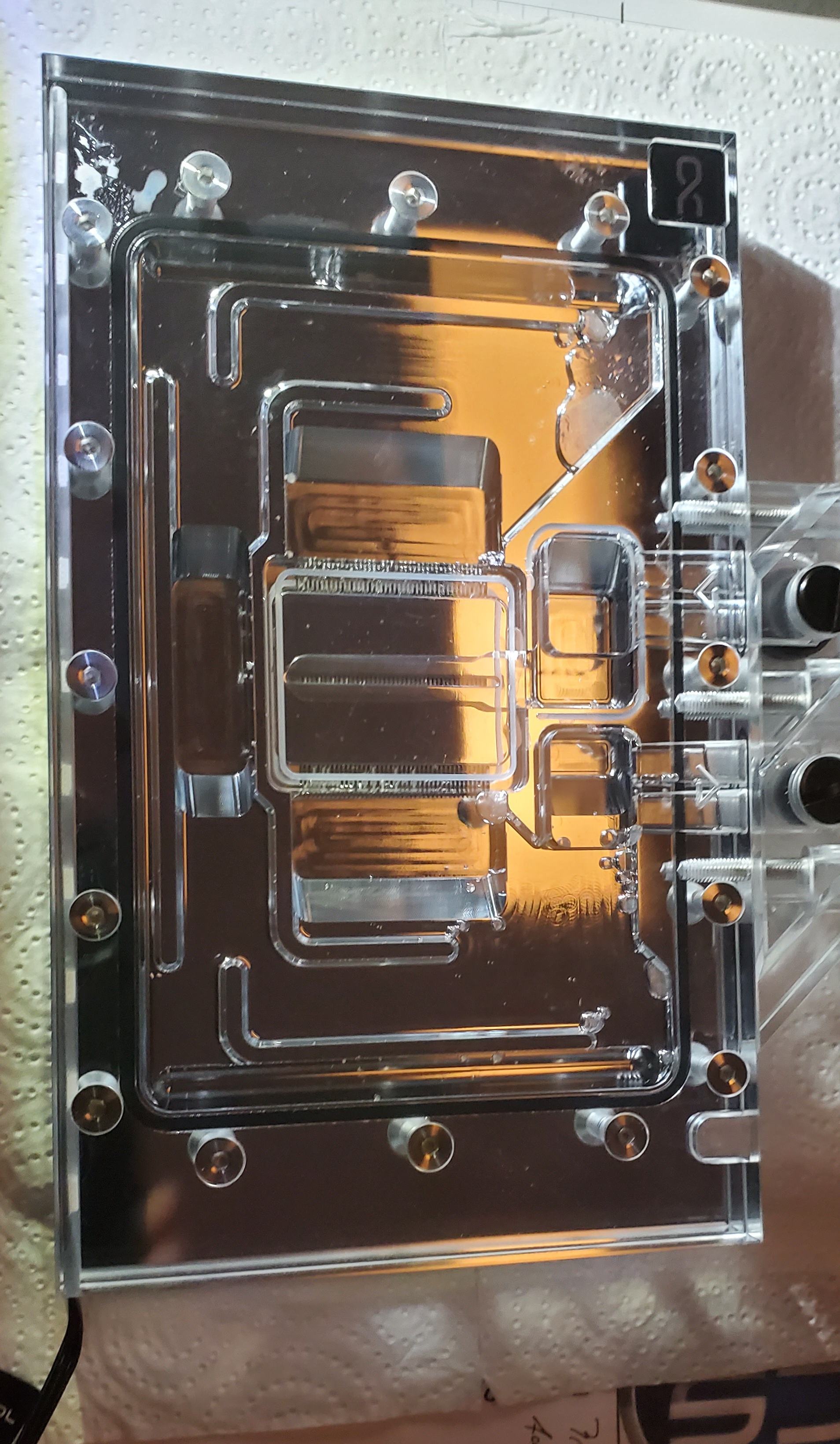 beim genauen betrachten des GPU-Wasserblocks habe ich um die Befestigungsschrauben folgende Entdeckung gemacht. Es sieht für mich so aus als wäre da mal Flüssigkeit zwischen Block und Acryl gelangt. Ich hätte gern dafür aber noch eine 2te Meinung.