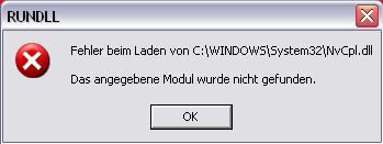 Ich habe mir kürzlich eine X800 Pro gekauft. Bevor ich sie eingebaut habe, habe ich die Treiber von der Nvidia-Karte gelöscht und den Rechner herruntergefahren. Soweit so gut Graka's getauscht bzw. neue eingebaut Rechner hochgefahren und ATI-Treiber installed. Nach dem darauffolgenden Neustart bekam ich eine Fehlermeldung die ich bis jetzt immer noch bei jedem Start bekomme (siehe Bild). Ich denke mal das es sich um eine fehlende deinstallation bestimmter Einträge oder Programme handelt. Wie kann ich den Fehler beheben ohne zu formatieren?