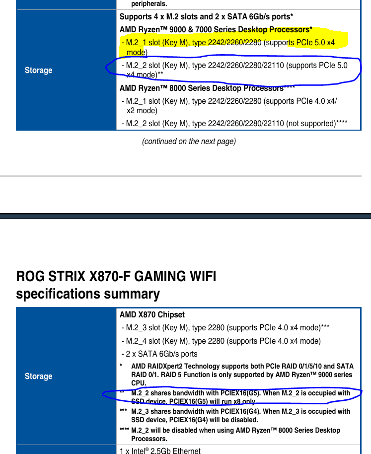 Faktisch also nur 2x M.2, 2 weitere mit gewissen Einschränkungen => Dafür tuts ein 220-240€ B650E Board um die Hälfte des Preises aber auch... Oder halt X670E (wobei die EOL gehen und man da schauen muss, Asus X670E TUF und Prime find ich okay).