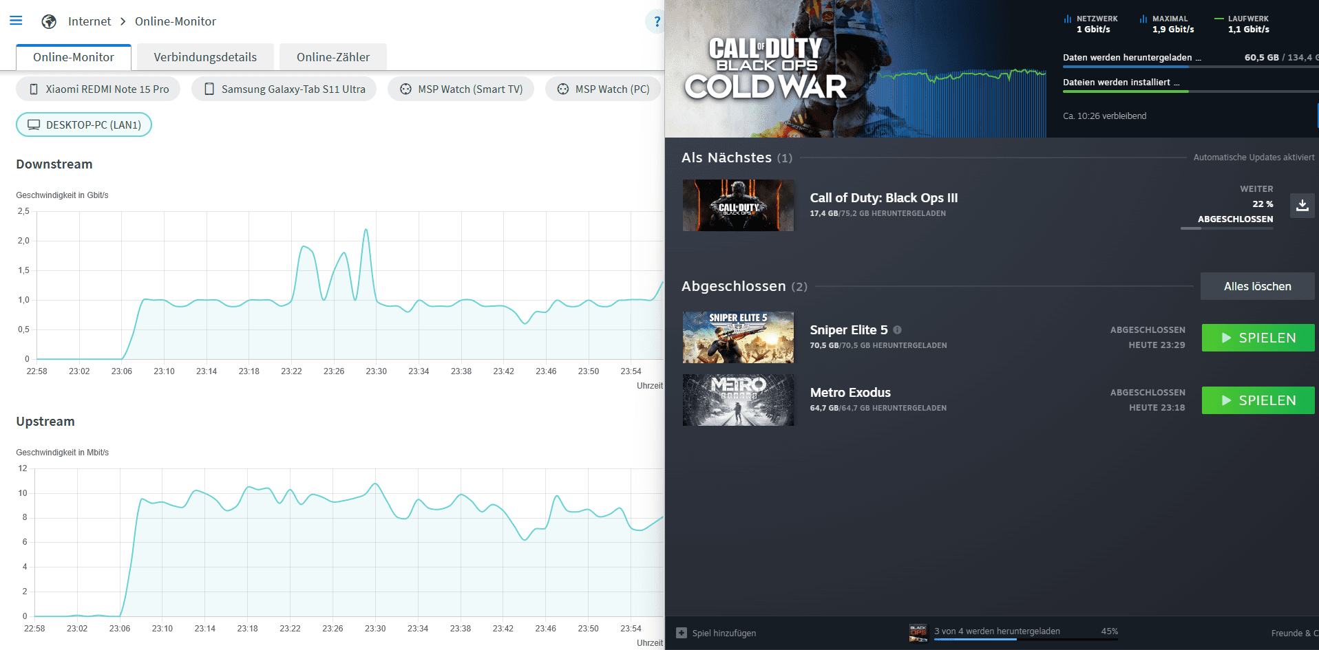 ..heute vormittag sind rund 500GB im DL via Epic Installer und diverse andere DL mit durchschnittlich 800~1000Mbit/s erfolgt, vorhin dann noch einmal rund 300GB via Steam mit 980~1150Mbit/s und Peaks bis 1,9Gbit/s.