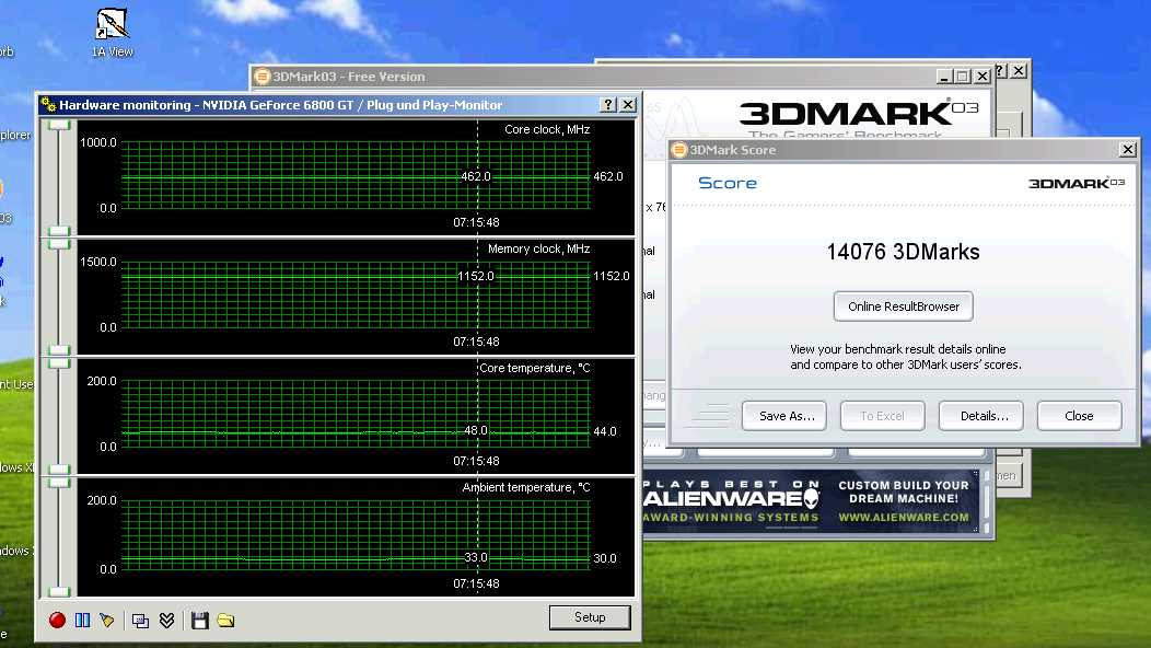 zerstören? die karte läuft jetzt mit 556/1180 Mhz und Rivatuner zeigt mir im idle 46 Grad und unter last 48 Grad kann das sein? habe im AquMark3 75400 pk und im 3DMark03 13877 pk wie weit kann ich gehen ohne das die karte sich verabschiedet?