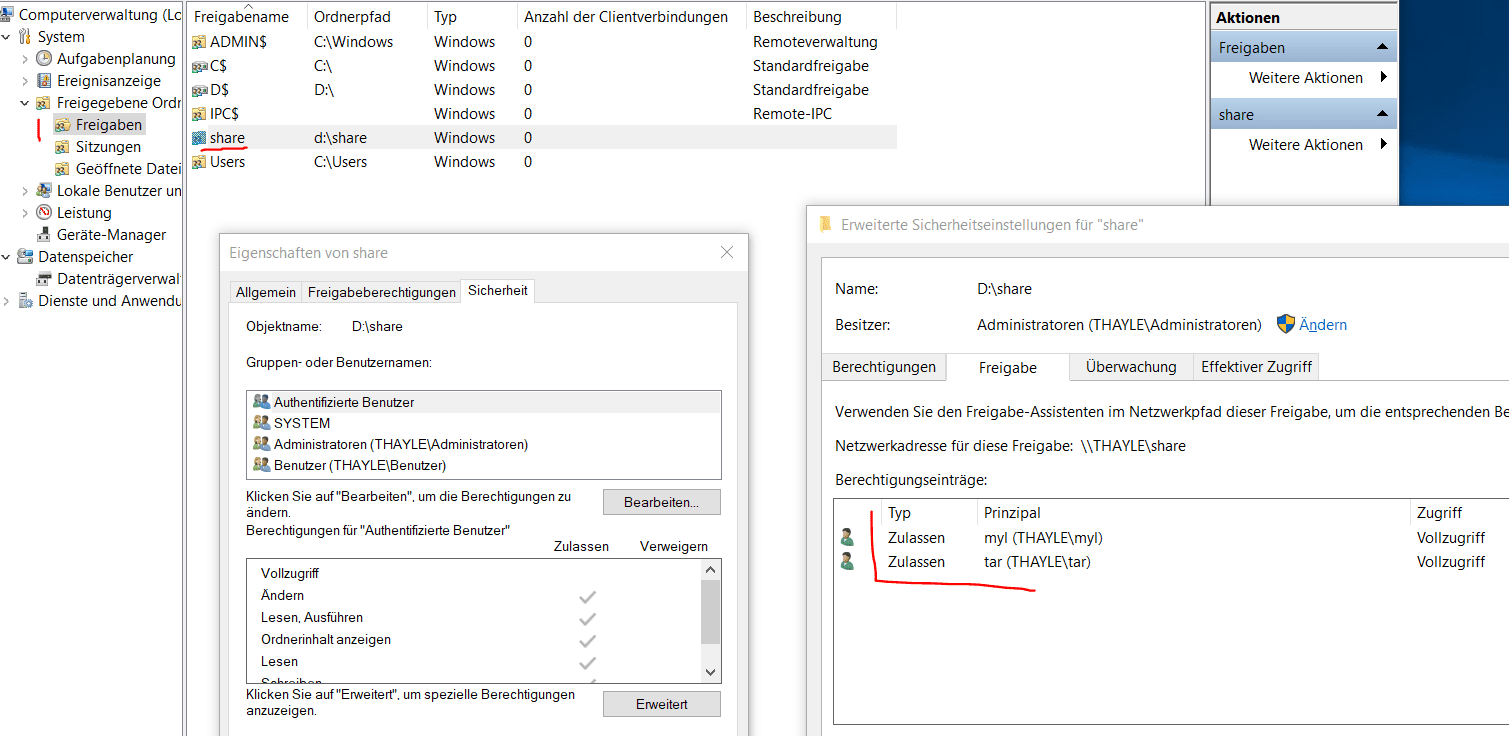 ich habe in der Verwaltung eine Freigabe mit Vollzugriff für 2 Benutzer erstellt, damit ich zwischen Workstation und Handy/Laptop Daten austauschen kann. Hat bisher immer funktioniert, aber nun habe ich Windows neu installiert und irgendeine Einstellung scheint schief zu hängen oder zu fehlen. In den erweiterten Freigabeeinstellungen habe ich die Netzwerkerkennung eingeschaltet, die Dateifreigabe und kennwortgeschützte Freigaben aktiviert. Zusätzlich habe ich auch (obwohl das, glaube ich, nicht notwendig ist) das Windows Feature SMB 1.0/CIFS installiert. Zuguterletzt noch explizit die Dateifreigabe in der Firewall zugelassen. Mittlerweile auch schon mehrmals neu gestartet.