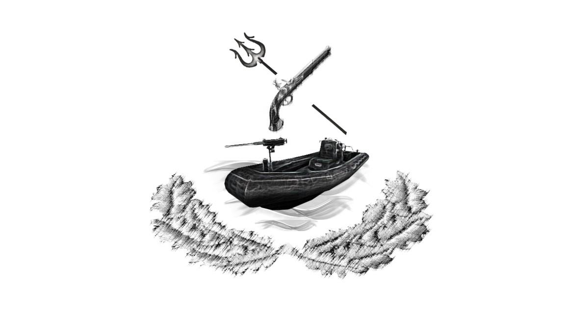 Hintergrund ist erst mal weiß darauf Eichenlaub in einer "U-Form" in dem "U" soll ein Bild einer Kampfbootbesatzung mit boot in frontalfahrt. Im hintergrund bzw gut erkennbar aber hinter dem Boot eine Muskete gekreuzt mit einem Dreizack.