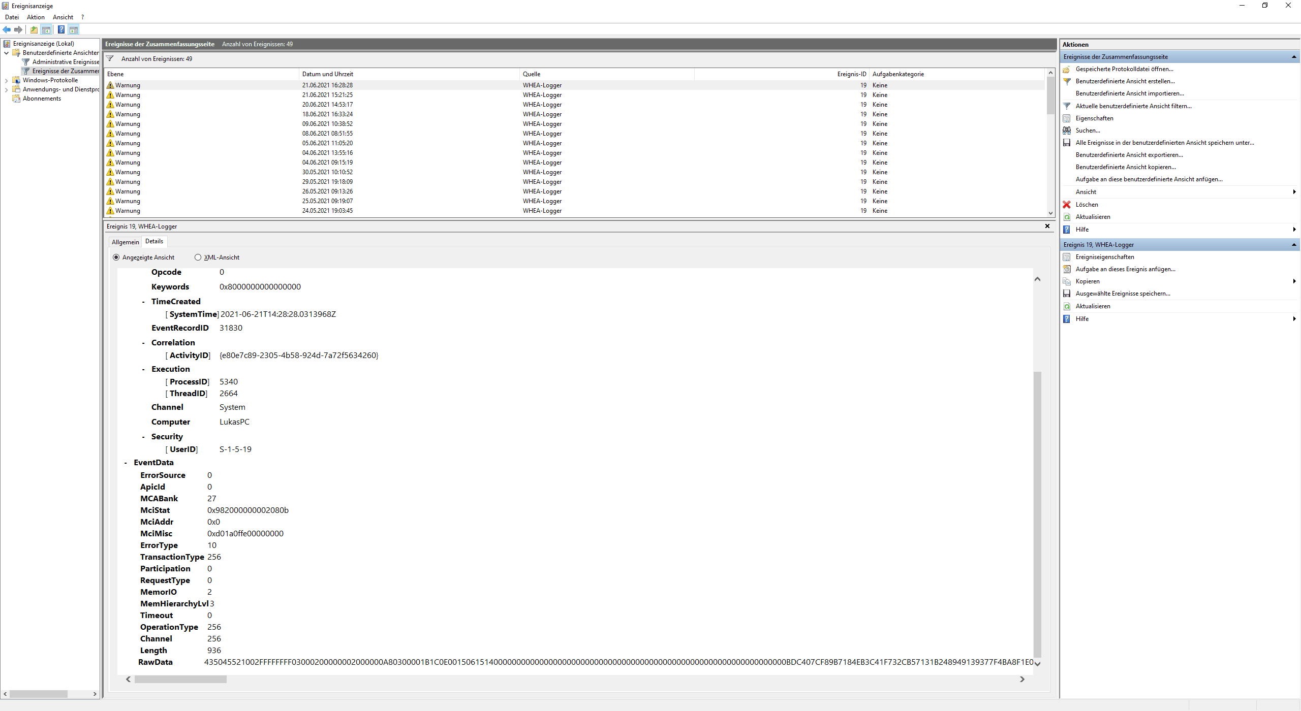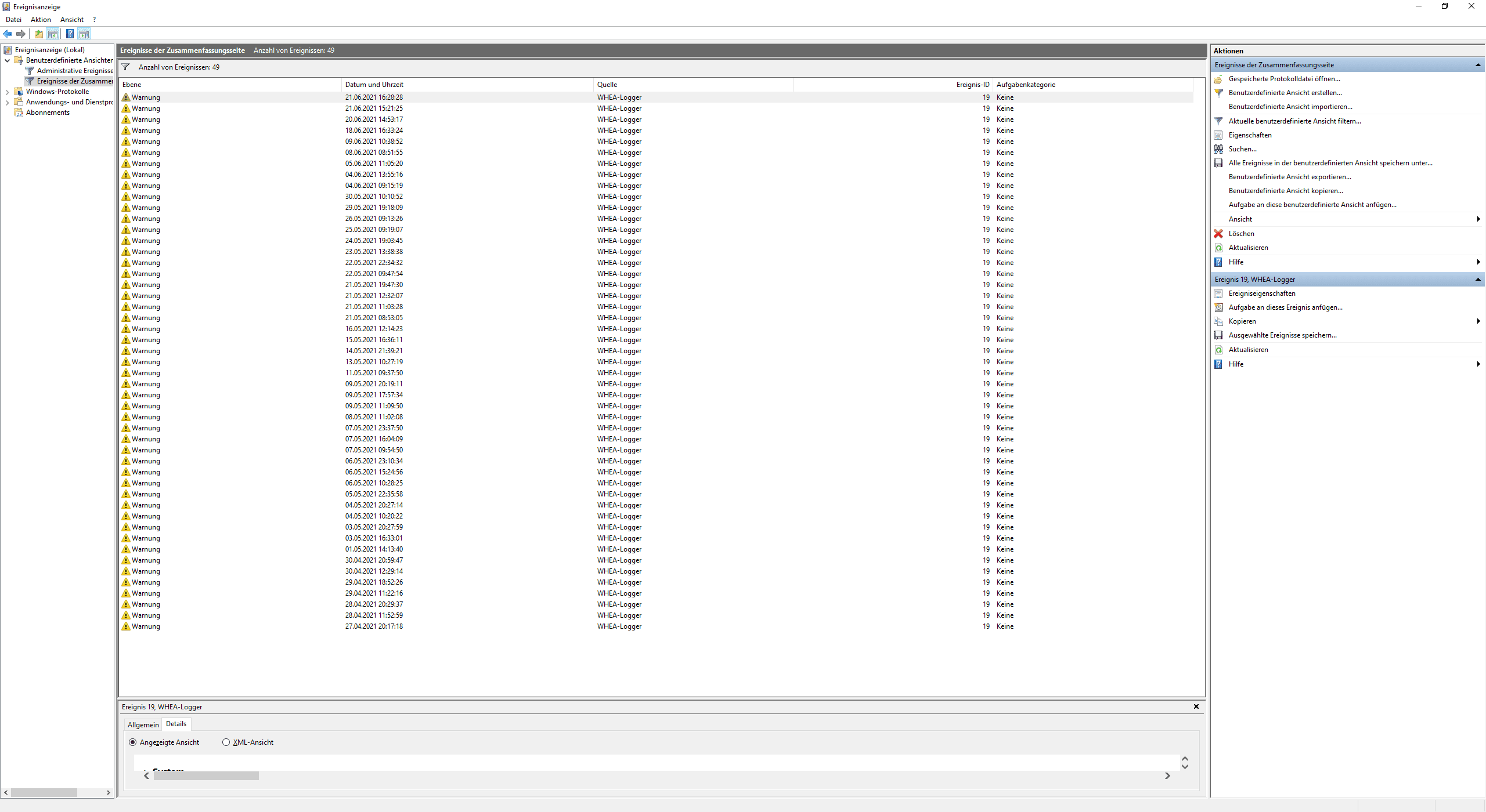 Dadurch bin ich auch mal auf die Ereignisanzeige auf den WHEA Logger aufmerksam geworden.