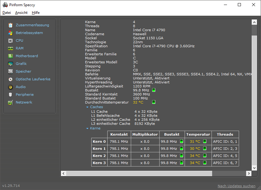 Whatever. Der "System Information Viewer" kann das, was ich wollte - also für jeden Anschluss individuelle Lüfterkurven festlegen oder auch für jeden Anschluss direkt eine Drehzahl vorgeben. Und die Funktion "Kalibrieren" (wollte einfach mal gucken, was passiert) hat ordentliche Arbeit geleistet. Alles noch ein Stück leiser geworden und Piriform "Speccy" (Portable) zeit gut 3 bis 4 Grad weniger an.