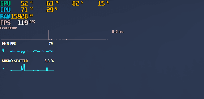 Zum Messen der Micro-Stutter nutze ich die Metrik von AMD Adrenalin. Diese treten unregelmäßig auf, mal mehr mal weniger - mal liegen diese bei 1,2% mal bei 2,2%. Selten bei 4-5%. Aber manchmal gibt es auch heftigere Stutter (vorallem bei TLOA bis zu 8/9%).