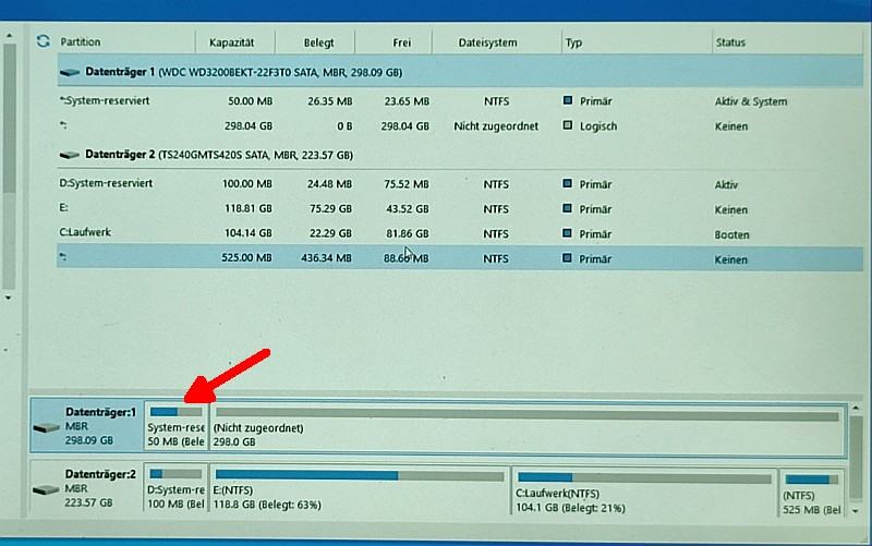 Ich hatte noch eine vollkommen nackte HDD im SATA-schacht, die sollte danach als Datenhalde dienen. Doch sie ist im System auch die erste Patte und Win10 hat darauf die eigene Bootpartition angelegt (ca. 50MB). Schöne Pleite!