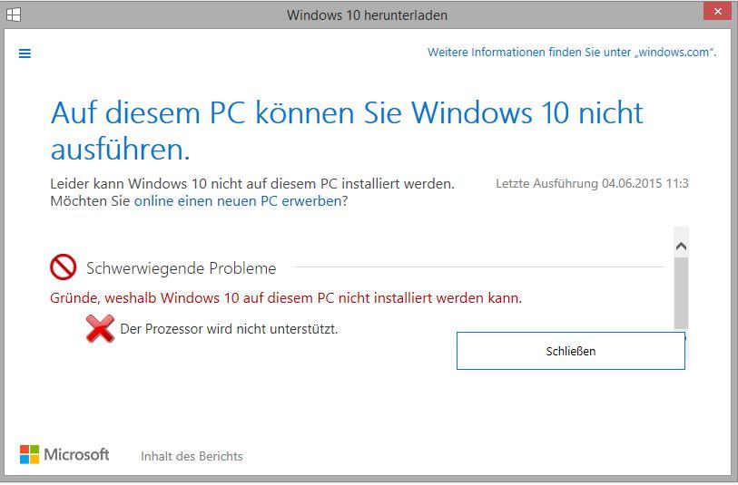 mein Win10 Upgrade Test scheiter an meiner CPU: