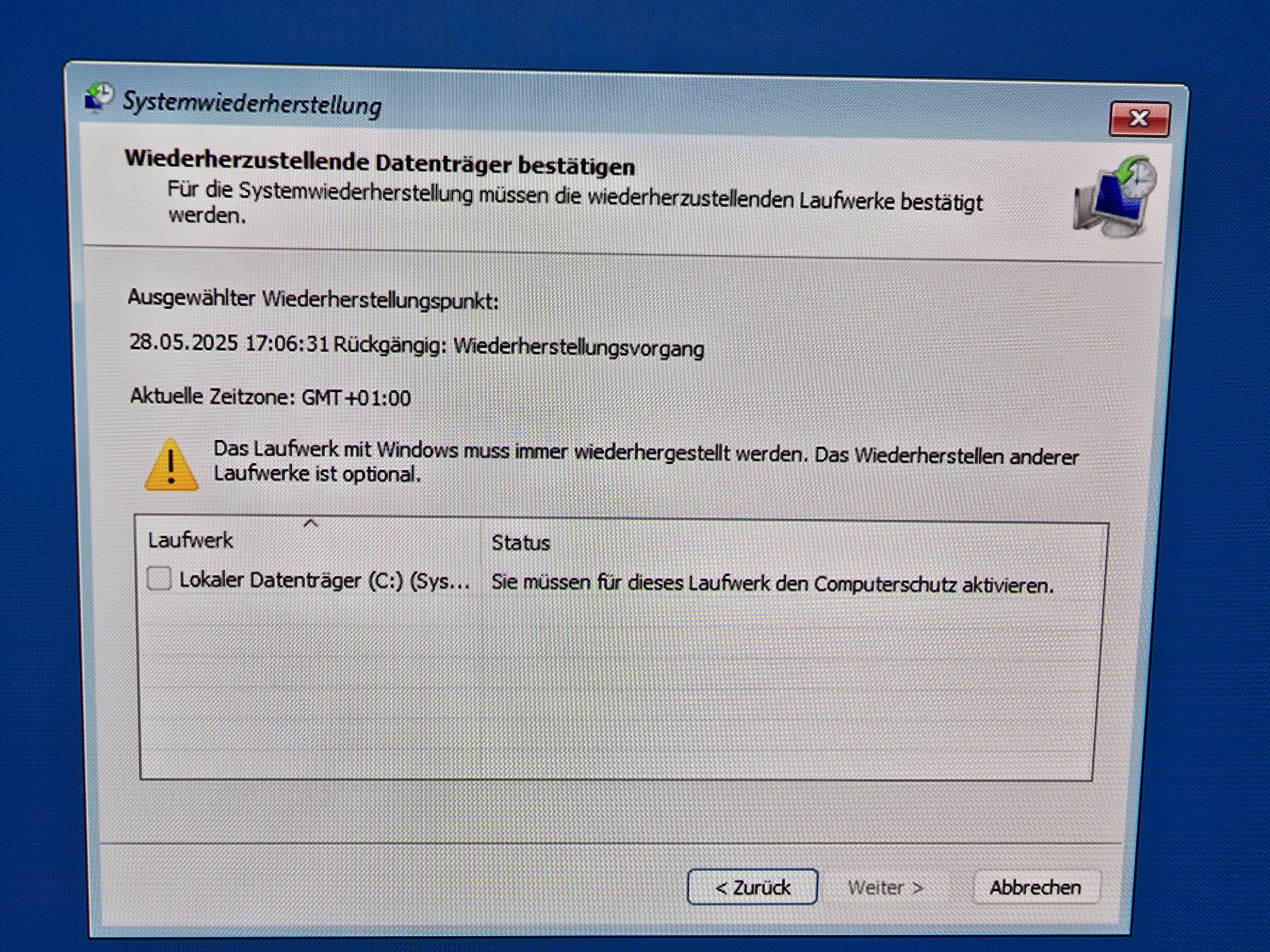 Aber leider wenn ich ein Wiederherstellungspunkt auswählen möchte, wird mir folgendes angezeigt, kann beim lokalen Datenträger auch keinen Haken setzen.