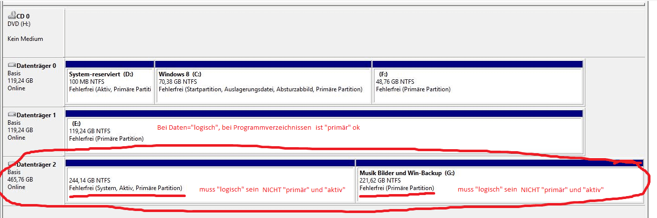 Danach hat man bei Windows 8 die richtige Bootpartition und eine eventuell zu große Systempartition, die man mit der Datenträgerverwaltung verkleinern kann.