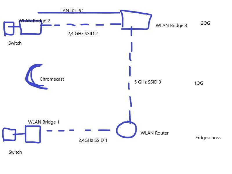 Kurzbeschreibung: Router stellt 2,4er Netz für die erste Bridge zur Verfügung. Router stellt 5er Netz für die dritte Bridge zur Verfügung. Dritte Bridge stellt wieder ein 2,4er für die zweite Bridge zur Verfügung sowie per LAN den Anschluss für den PC. Das ganze läuft auch mit den aktuellen Geräten aber leider teilweise nicht wirklich stabil bzw. performant.