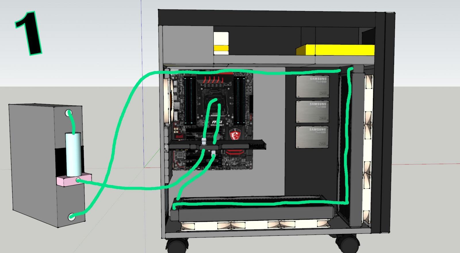 ein Mora3 420 LT mit 4x Noctua 200mm Lüfter kommt neben den PC mit Schnellkupplungen