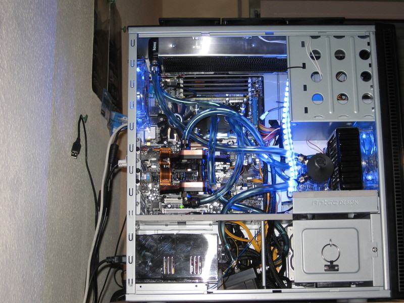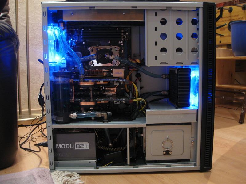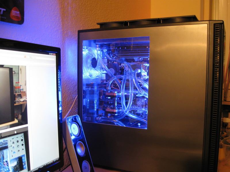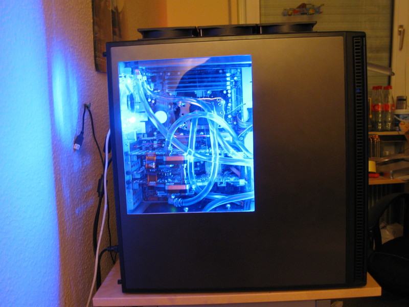Hier kommt alles zusammen. Der Aquaero sitzt übrigens auch hier. Ein kleiner 80mm Lüfter wird in Zukunft etwas kühle Luft in die obere Kammer pusten, damit diese noch etwas heruntergekühlt wird. Zusätzlich kommt noch ein Staubfilter außen an das Gehäuse.So, viel Text um etwas, was eigentlich nur ein Teil meiner Hobbys ist. Da ich mich viel mit Autos und Musik befasse, könnt ihr euch ja vorstellen, warum ich beim PC etwas spare