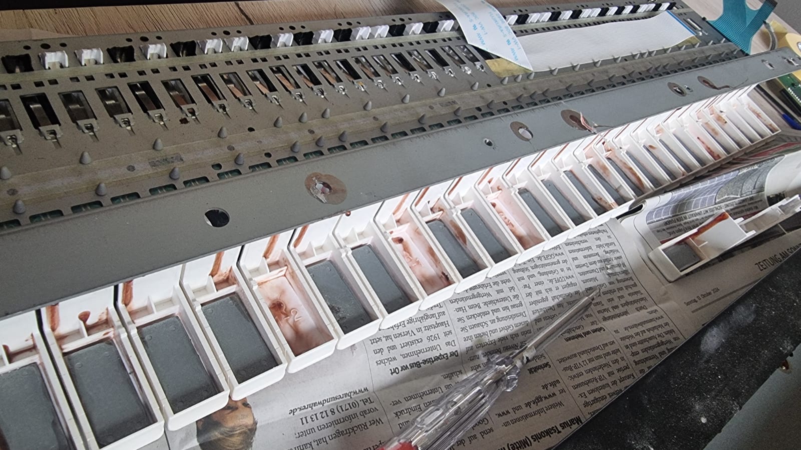 Was auch immer Roland um 1990 rum geritten hat den Kleber zu benutzen: Er Zerstört bis heute zahlreiche Instrumente. Der Kleber läuft bei Temperatur zähflüssig unter den Tastengewichten hervor und tropft bei den schwarzen Tasten auch gerne auf das PCB oder den Kontakten auf dem PCB. Das große Problem ist auch das manchmal auch die Filze betroffen sind die die Tastenbewegungen dämpfen sollen.