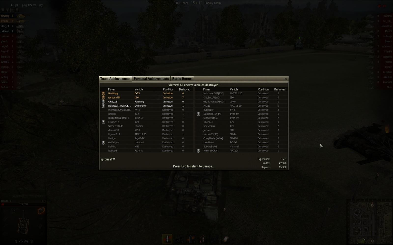 Mit der 100SA47 wird der AMX50/100 ganz schon stark. Wenn zwei AMX auf einen IS3 feuern, kommt der IS3 nur zu einem Schuss bis er platzt. Nur sollte man immer mit bedacht feuern, sonst wird es schnell teuer. Ein Magazin kostet 6130 K, somit liegen die Munikosten schnell bei 20 bis 30K + Reparatur ca. 12K.