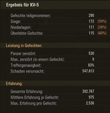 kann ich zum KV 5 nur sagen: normal zwischen 50-70 K + mit Premium. Es gibt Ausreißer mit 100K, sind aber eher selten (siehe Bild) Bin aber auch kein Profi mit dem Teil. Ich glaub Leni war hier der Crack mit dem KV5?!