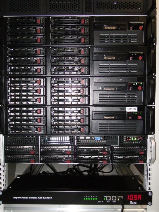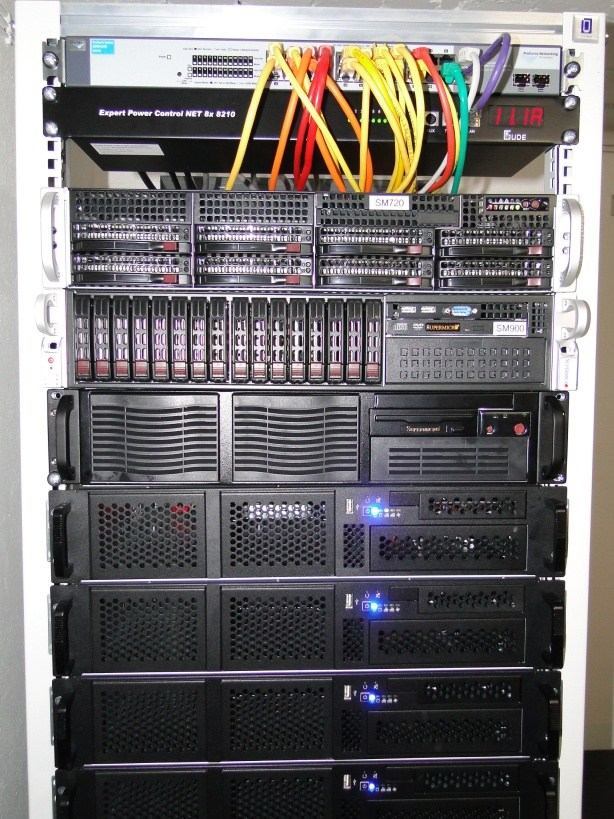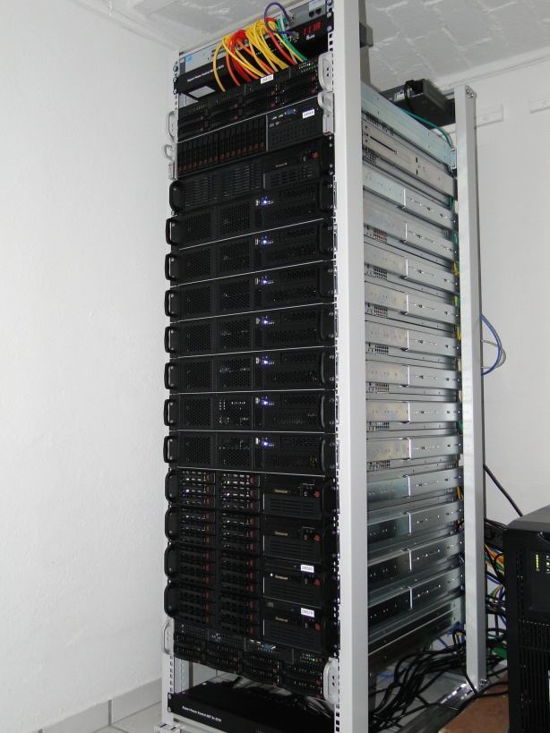 Es sind 2x 10,5 A + 1x 3A - die dritte PDU ist bestellt, aber noch nicht da. Sobald die da ist wird das Ganze auf 3x 8 A aufgeteilt, damit die 3 USVen gleichmäßig ausgelastet werden. Die Rechner laufen manchmal durchgehend auf Vollast, überwiegend sind sie aber aus. Deshalb sind die schaltbaren PDUs auch Pflicht - der Cluster verbraucht ausgeschaltet ~600WDu brauchst entweder nen größeren Raum, oder nen Weitwinkel für deine Cam.