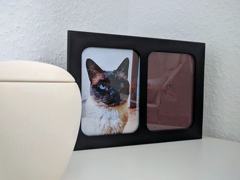 Habe gerade ein Foto von Phil in den Bilderrahmen neben seinen Pfotenabdruck gemacht, wo bisher nur ein Platzhalter mit dem Namen war.